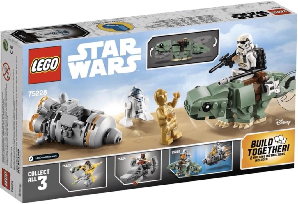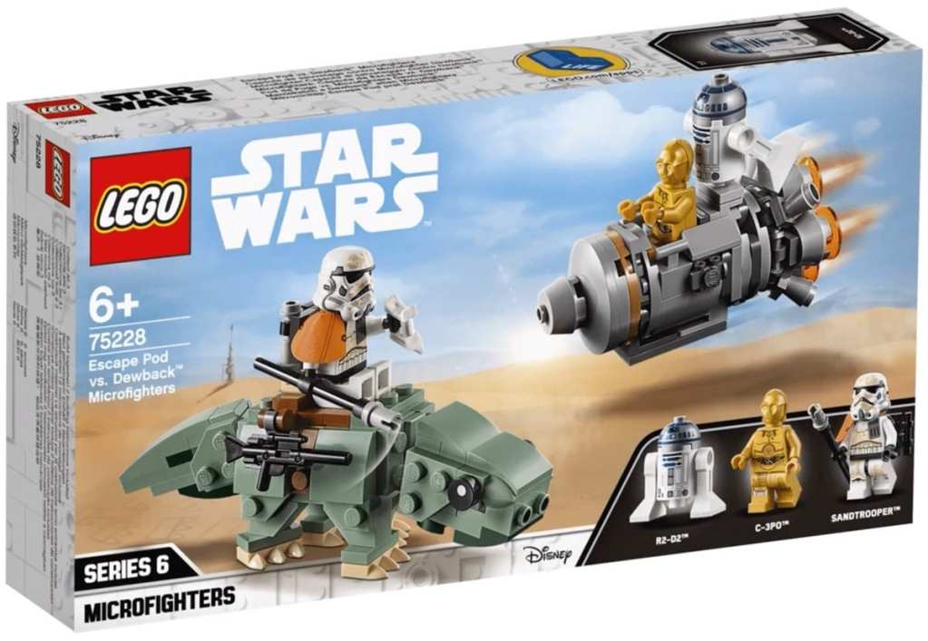 Spiele epische LEGO® Abenteuer mit dem LEGO Star Wars™ „Escape Pod vs. Dewback Microfighters“ (75228) Bauspielzeug-Doppelpack. Dieses Set enthält eine Rettungskapsel mit Motordetails und Platz für die LEGO Figuren von C-3PO und R2-D2. Der baubare Dewback verfügt über einen verstellbaren Kopf und Schwanz, Halterungen für die Ausrüstung und einen Sitzplatz für den Sandtrooper. Dank separater Bauanleitungen für die einzelnen Modelle können Star Wars Fans das Bauerlebnis mit ihren Freunden und ihrer Familie teilen.