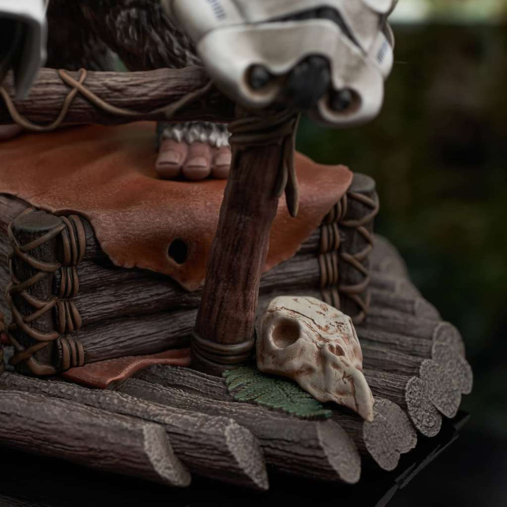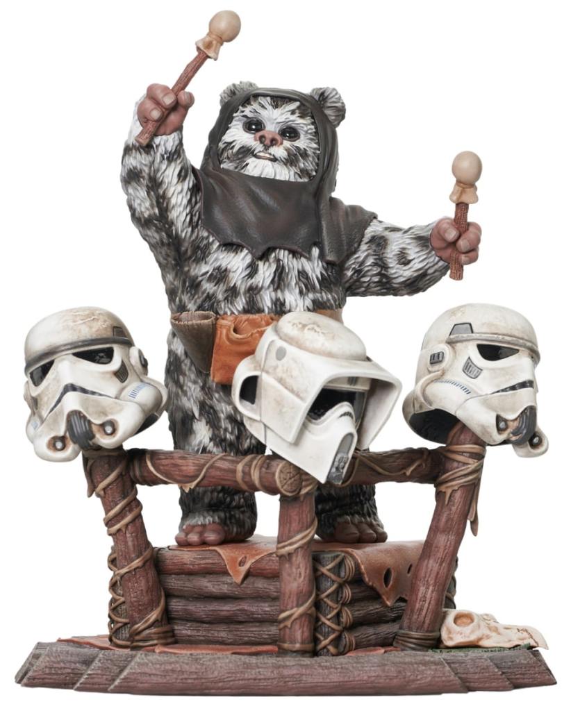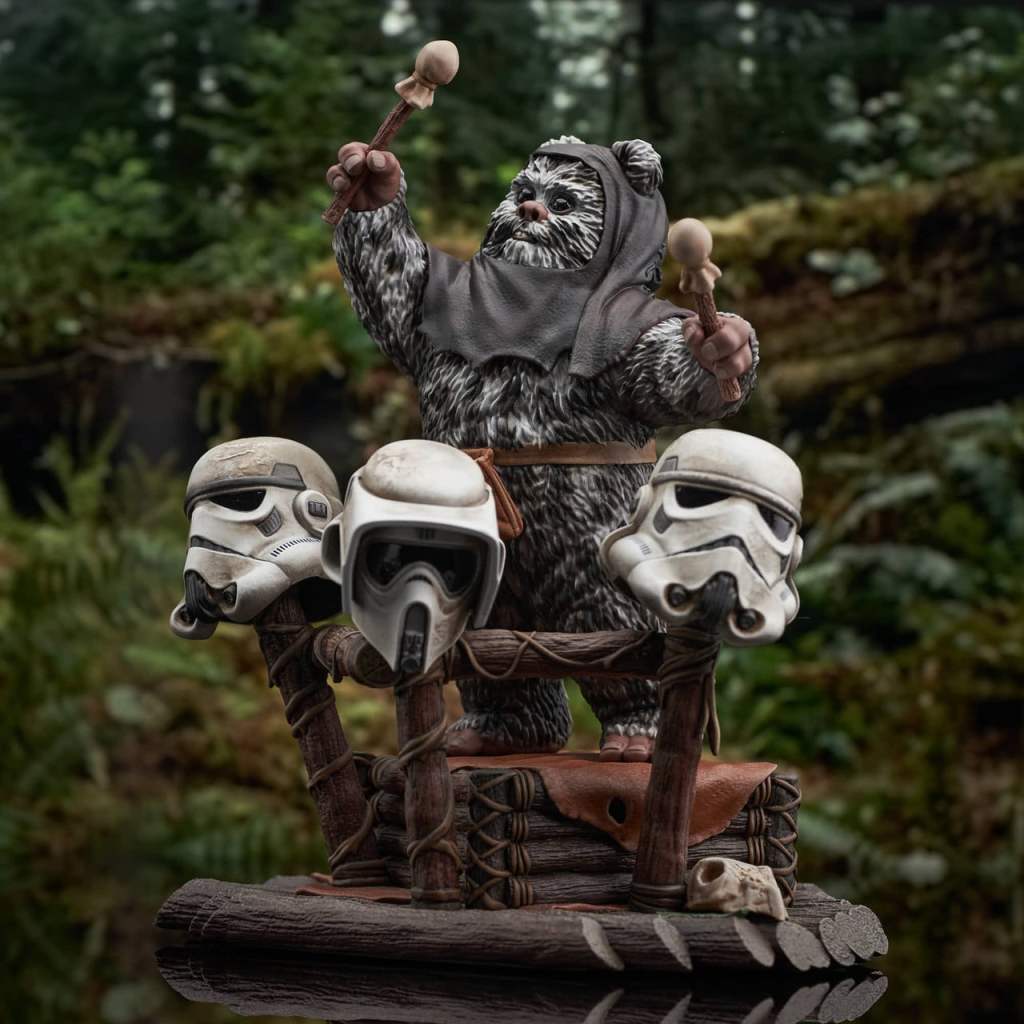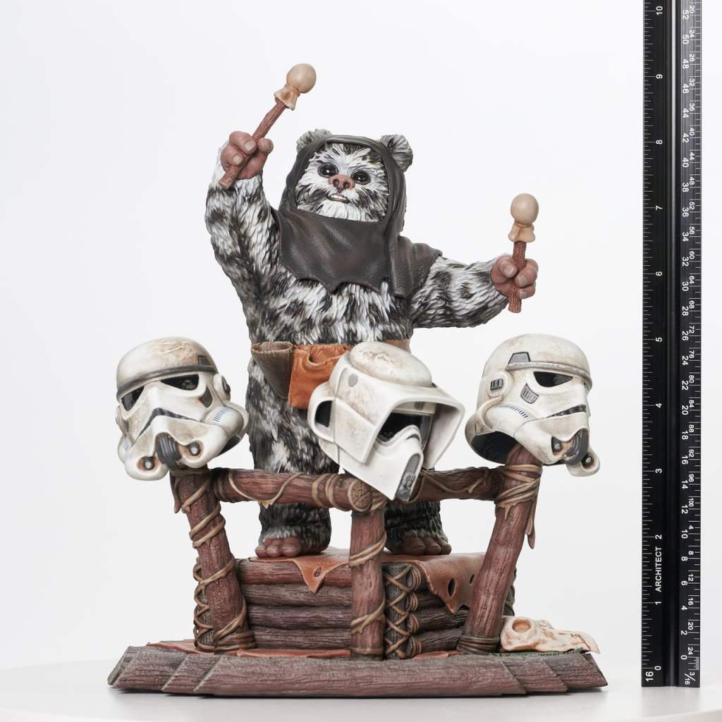 A Gentle Giant LTD release! Yub yub! Time to celebrate! With the second Death Star destroyed, and Imperial forces on Endor’s forest moon on the run, it’s time for an Ewok party, featuring a drum solo on Stormtrooper helmets! The Ewok drummer, Breethupp, raises his drumsticks as he prepares to drop a beat on three helmets, in a scene straight out of Star Wars: Return of the Jedi. Measuring approximately 9 inches tall, this 1/6 scale statue features detailed sculpting and paint applications, and is limited to only 500 pieces. It comes packaged in a full-color box with a numbered certificate of authenticity.