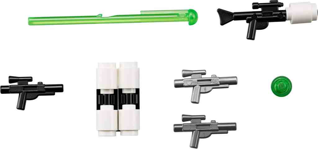 Hierzu zählen die federunterstützten Doppelshooter, der auf dem Dach montierte Doppelshooter und die Luke, hinter der eine Minifigur Platz findet, die Pilotenkabine mit aufklappbarer Luke und der Laderaum mit Platz für 4 Minifiguren, die grossen Hecktriebwerke und die unsichtbaren durchsichtigen Räder, dank denen das Modell zu schweben scheint.