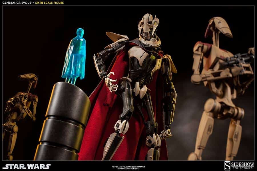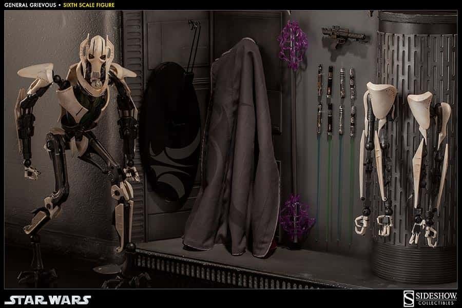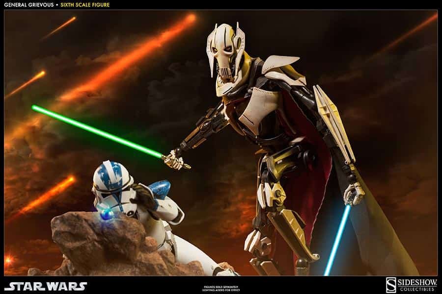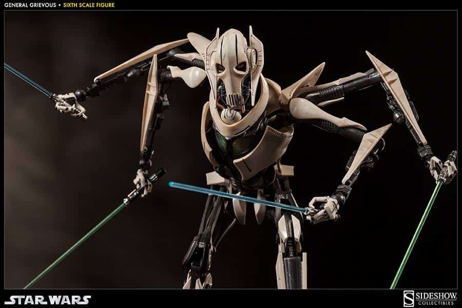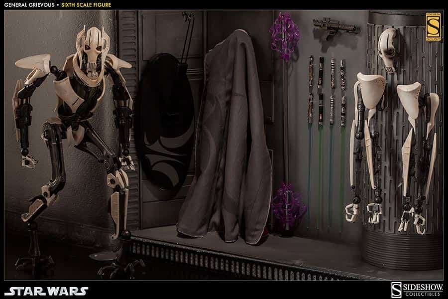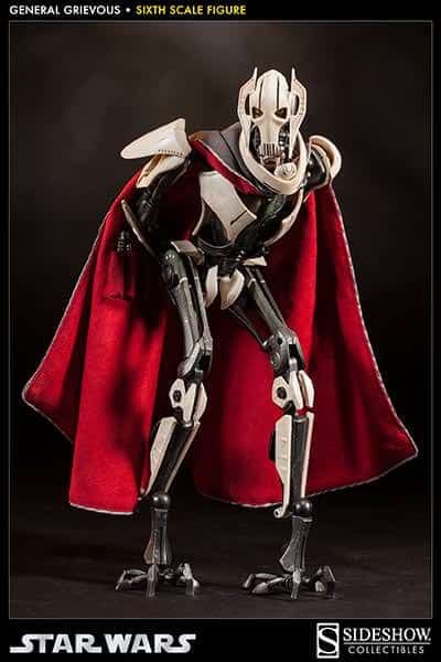 With the Galactic Republic in shambles, a powerful new Confederacy of Independent Systems forms a droid army of incomprehensible size. General Grievous, a brilliant military strategist and remorseless killer, leads the Armies of the Confederacy, waging a deadly war for control of the galaxy. Sideshow Collectibles is proud to introduce the long-awaited General Grievous Sixth Scale Figure. Engineered with meticulous attention to detail, the fully articulated body can achieve countless poses, recreating vivid scenes of battle and victory. Fully equipped with detailed weapons and accessories including switch-out fused and split arms, four lightsabers, electro staff, and a hand-tailored fabric cape, the General Grievous Sixth Scale figure is an essential addition for any Star Wars collector.