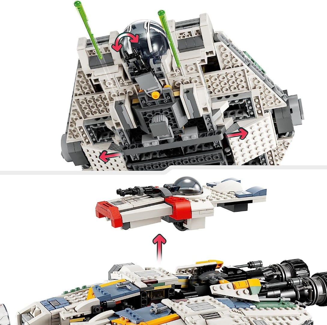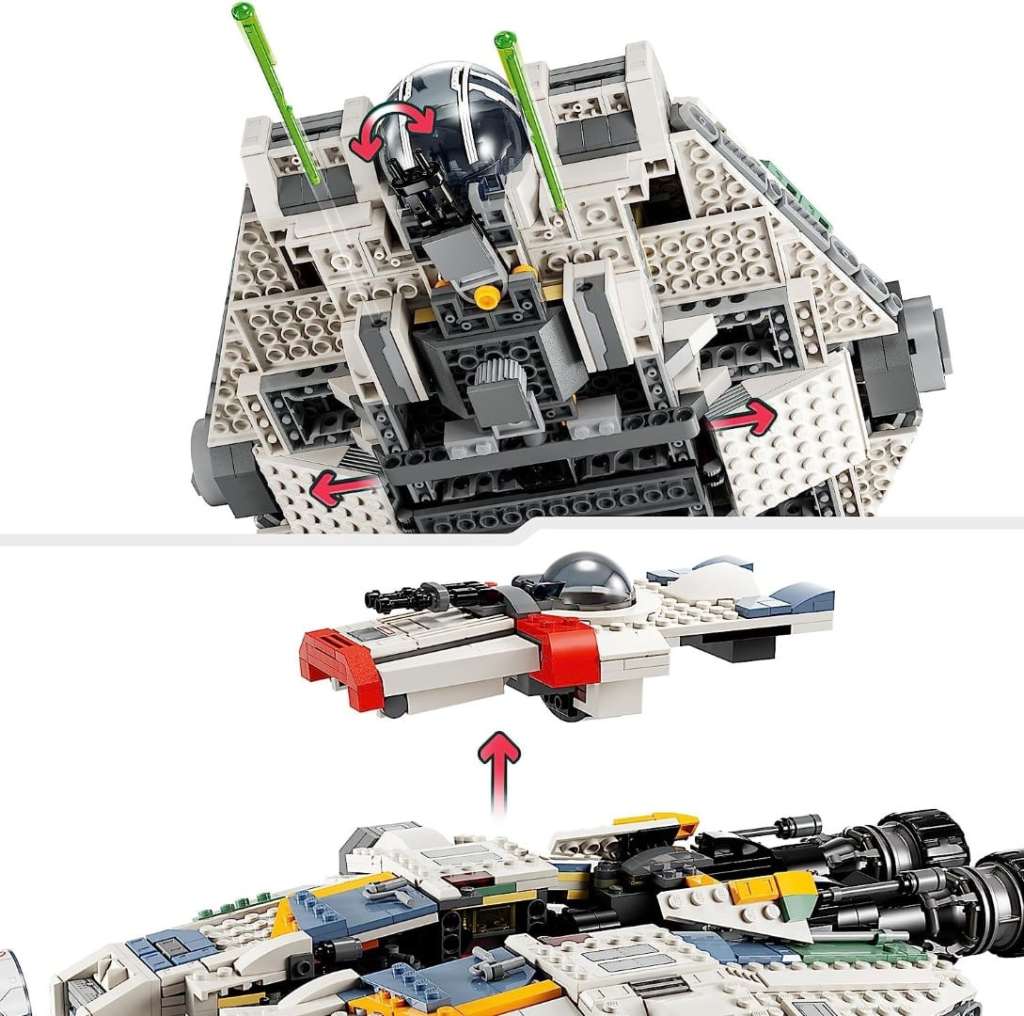 • Die Ghost: Das Sternenschiff verfügt über 2 Shooter mit Federmechanismus, ein LEGO® Minifiguren-Doppelcockpit mit abnehmbarer Frontpartie, 2 aufklappbare Luken und einen abnehmbaren Geschützturm mit Platz für eine LEGO Minifigur
