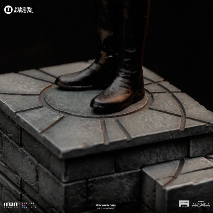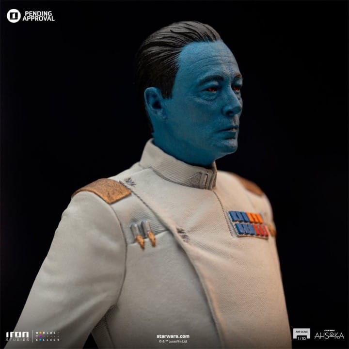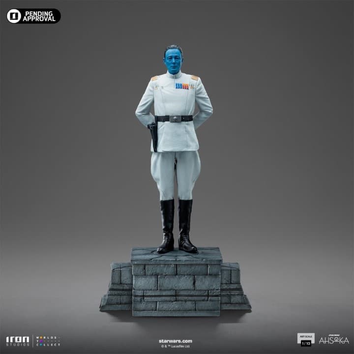 Recognized in his early military career as Mitth’raw’nuru, a high rank in the army, the Grand Admiral of the Imperial Navy during the age of the Galactic Empire, an alien from the Chiss species native from planet Rentor of blue skin looking as cold as his countenance and red eyes as sinister as a predator’s. Known as a brilliant and relentless strategist, with his hands on his back, in a resting military position, wearing his white uniform of the commanding officer of the Chimaera, an Imperial I-class Star Destroyer modified and commanded by him, and bringing a charric, a Chiss weapon similar to a blaster, in the holster in the right side of his black belt. Over a lifted base with rocky aspects, reminiscent of the fortress kept by the three witches that call themselves the Great Mothers, Iron Studios present the Star Wars: Ahsoka Grand Admiral Thrawn 1:10 Art Scale Limited Edition Statue, with the fearsome and respected villain ready to take up his place as an Heir of the Empire. Made mostly of Polystone, this statues measures over 9 ½-inches tall.
