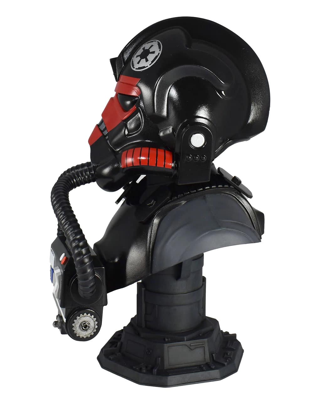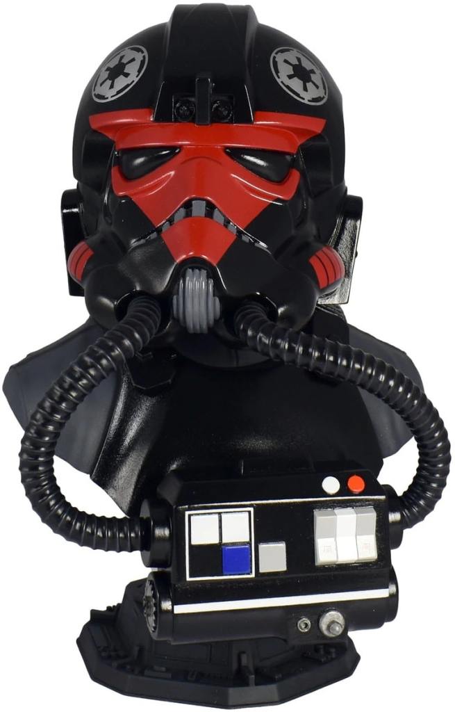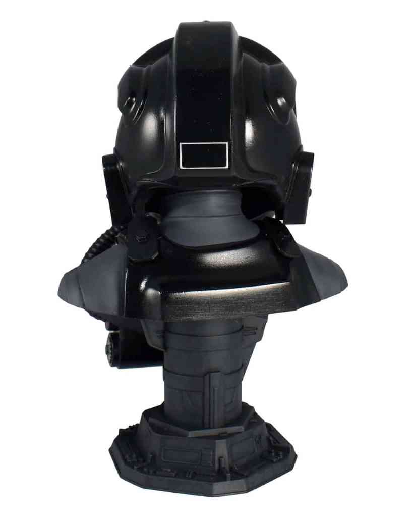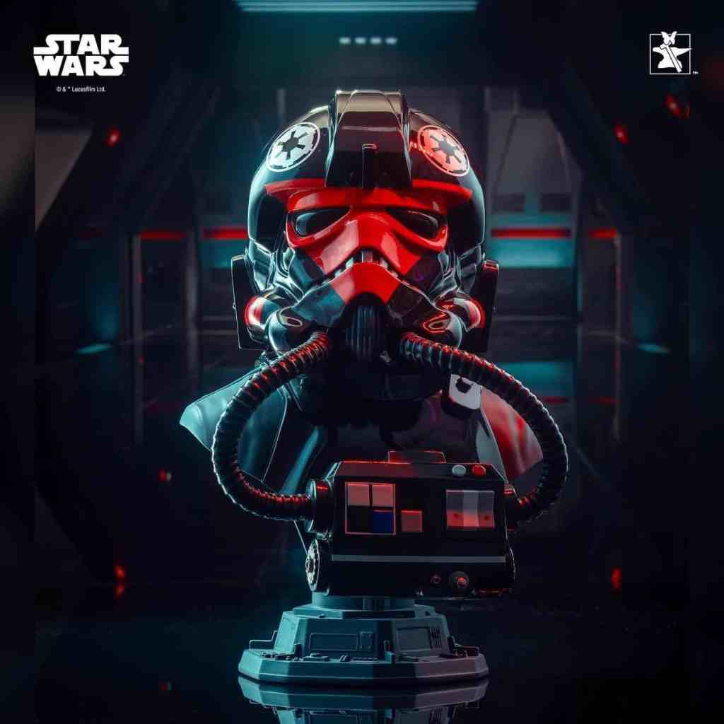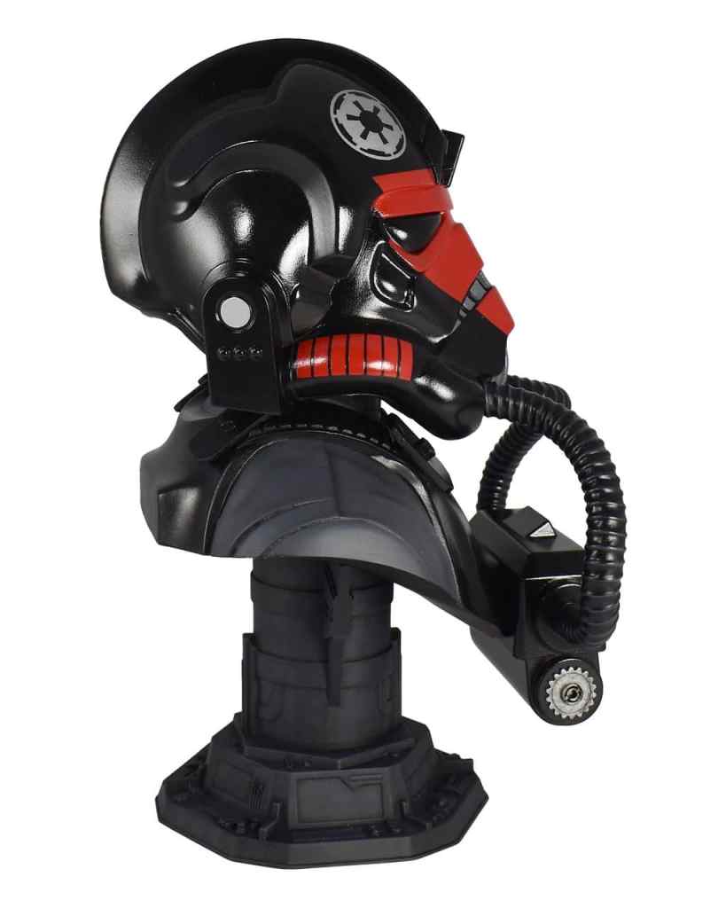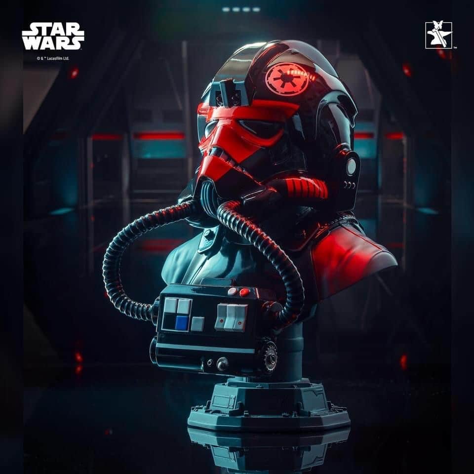 Emblazoned with a red skull emblem, this half-scale bust depicts a TIE Fighter™ pilot from the new game Star Wars: Squadrons™. Measuring approximately 10 inches tall, it features detailed sculpting and paint applications. This web-exclusive edition is limited to only 500 pieces and comes packaged in a full-color box with a numbered certificate of authenticity. Part of the Legends in 3D line!