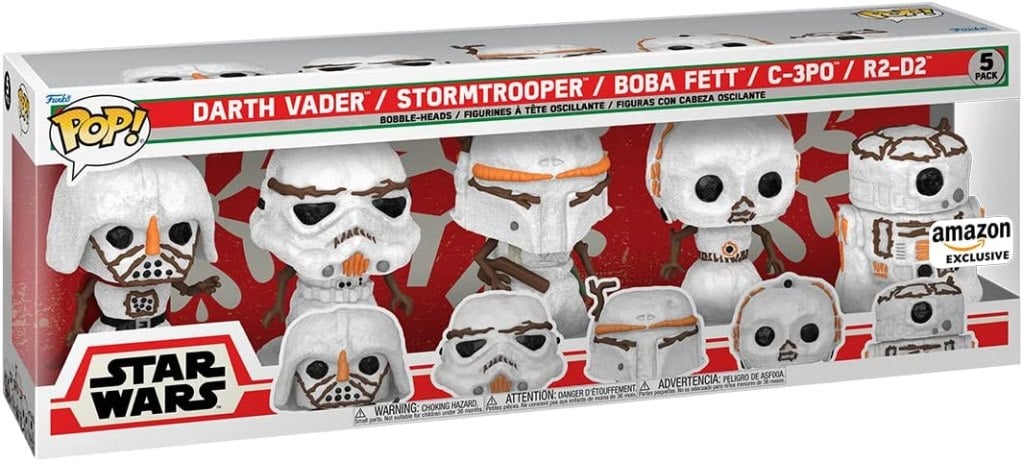 Spark intergalactic holiday fun with an Amazon-exclusive Star Wars™ Holiday 5-Pack set. This festive set includes Pops! Darth Vader, Stormtrooper, Boba-Fett, C-3PO, and R2-D2 as snowmen. These Pops! shimmer in white snowflakes, with carrots and twigs as finishing touches for various features on faces and armor. Celebrate the seasons with a few stellar characters and expand your Star Wars™ set. Vinyl bobbleheads are between 3.57 and 4.6-inches tall.