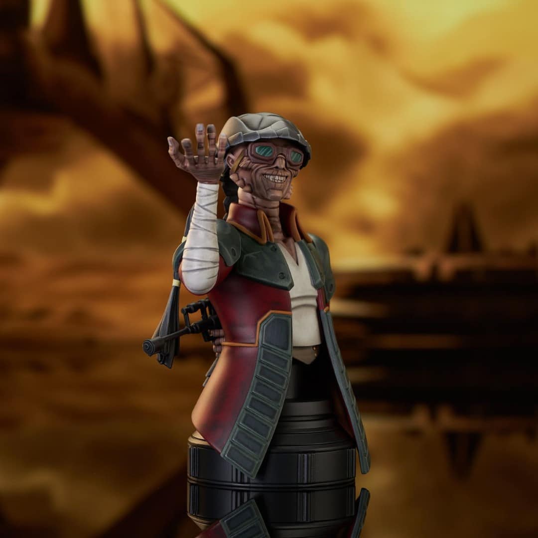 A Gentle Giant LTD release! The Outer Rim pirate Hondo Ohnaka makes his debut in the animated-style Clone Wars mini-bust line from GG LTD! Depicting the touch Weequay with a friendly grin, but hiding a blaster behind his back, this approximately 6-inch resin mini-bust is limited to only 3,000 pieces and comes packaged with a numbered certificate of authenticity in a full-color box.