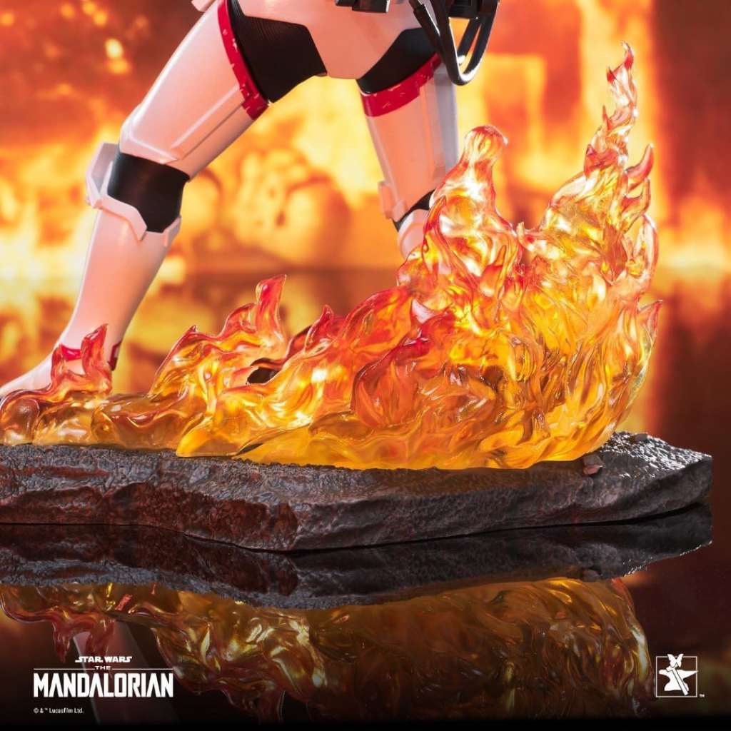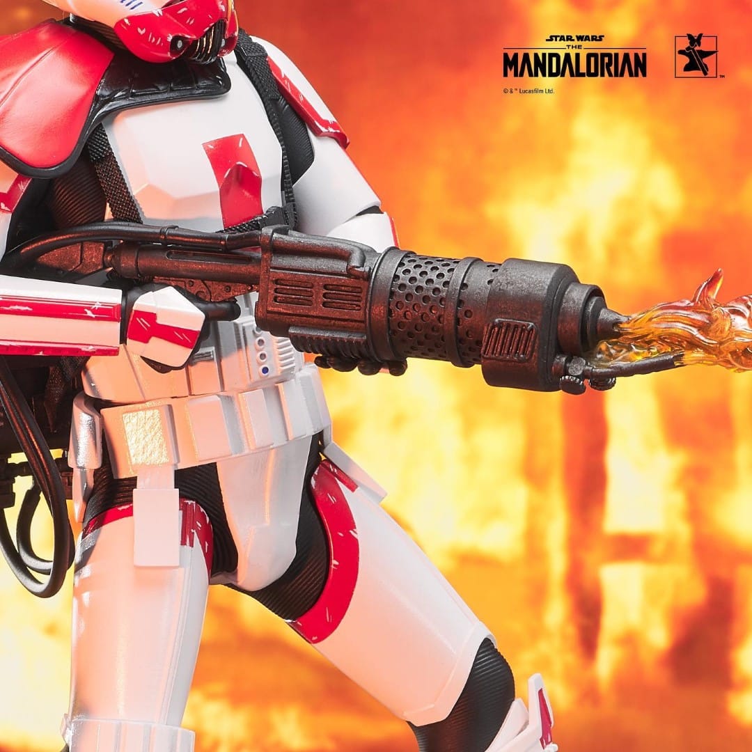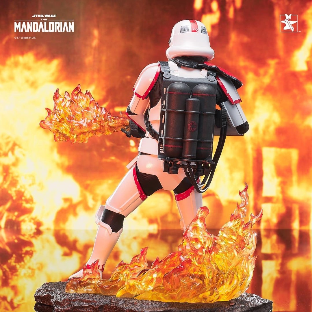Der Incinerator Trooper wird im Maßstab 1:7 produziert und steht in dynamischer Pose auf einer schicken Base mit Flammeneffekten. Der große Flammenwerfer kann wahlweise mit oder ohne Flammen präsentiert werden.