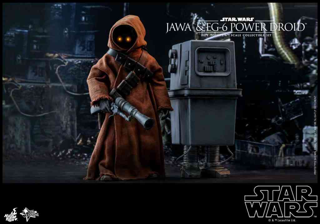 Meticulously created based on the appearance of the two characters in the movie, the 1/6th scale Jawa collectible figure features newly developed head with LED lights, skillfully tailored costume, variety of accessories, and a sand-themed figure base. The EG-6 Power Droid is finely crafted with detailed mechanical body with weathering effects, and also comes with a sand-themed figure base.