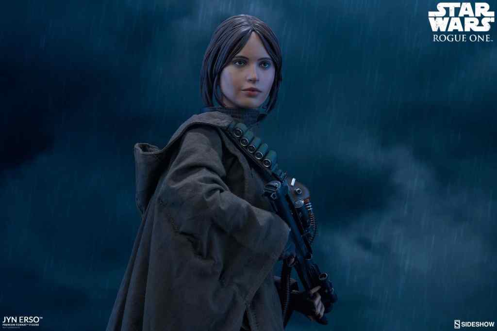Sideshow’s Jyn Erso Premium Format™ Figure is ready for action in a hostile and unforgiving environment. She is wearing a hooded weatherproof poncho with a portable breather mask hanging loosely around her neck and respirator pouch on her hip. She is also carrying a Blaster Rifle and an additional BlasTech A-180 Blaster as a backup sidearm in a thigh holster.