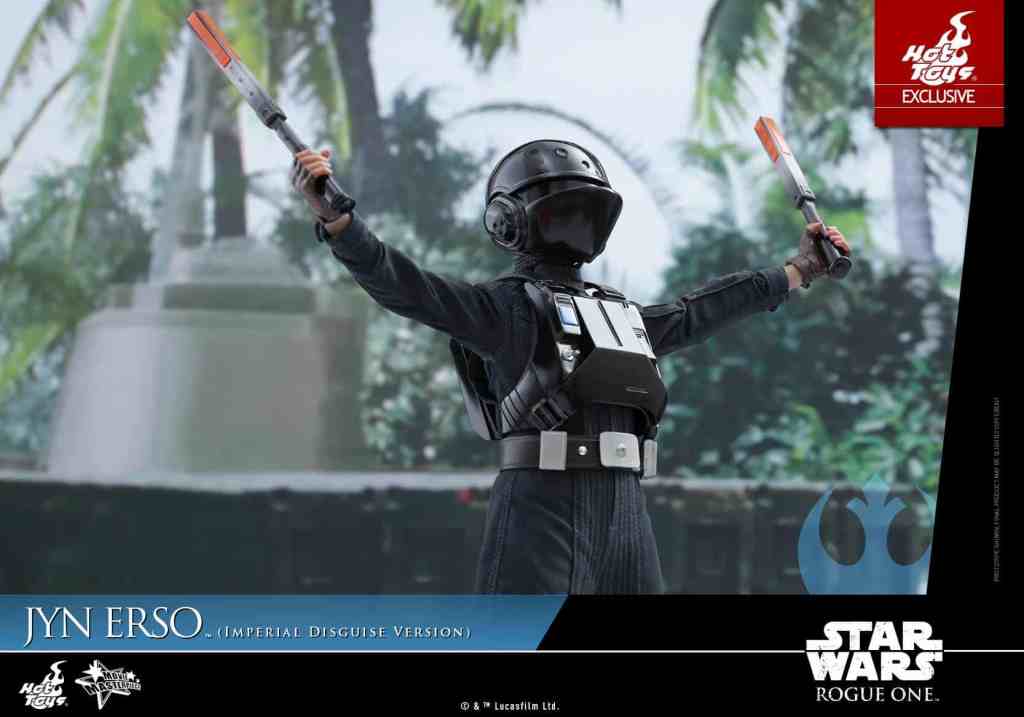 Skillfully crafted based on the appearance of Felicity Jones as Jyn Erso in Imperial disguise, the highly accurate collectible figure features a newly painted head sculpt of Jyn Erso, an interchangeable Imperial Ground Crew helmet, expertly tailored costume, a pair of batons, a blaster pistol, and a specially designed figure stand.