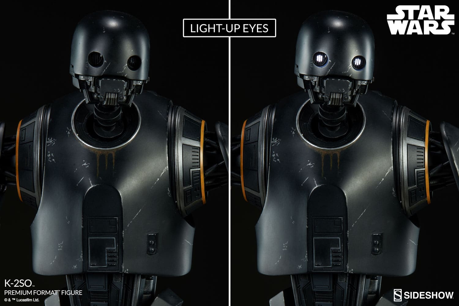 This Premium Format™ Figure is mixed media, featuring metal in K-2SO’s legs, which steadily support his unique gait. He is also outfitted with intricate pistons and gears in his various joints that allow you to observe K-2SO’s complex construction. The impressive imperial droid also features light-up eyes in his portrait, allowing you to display him with an ‘activated’ look.