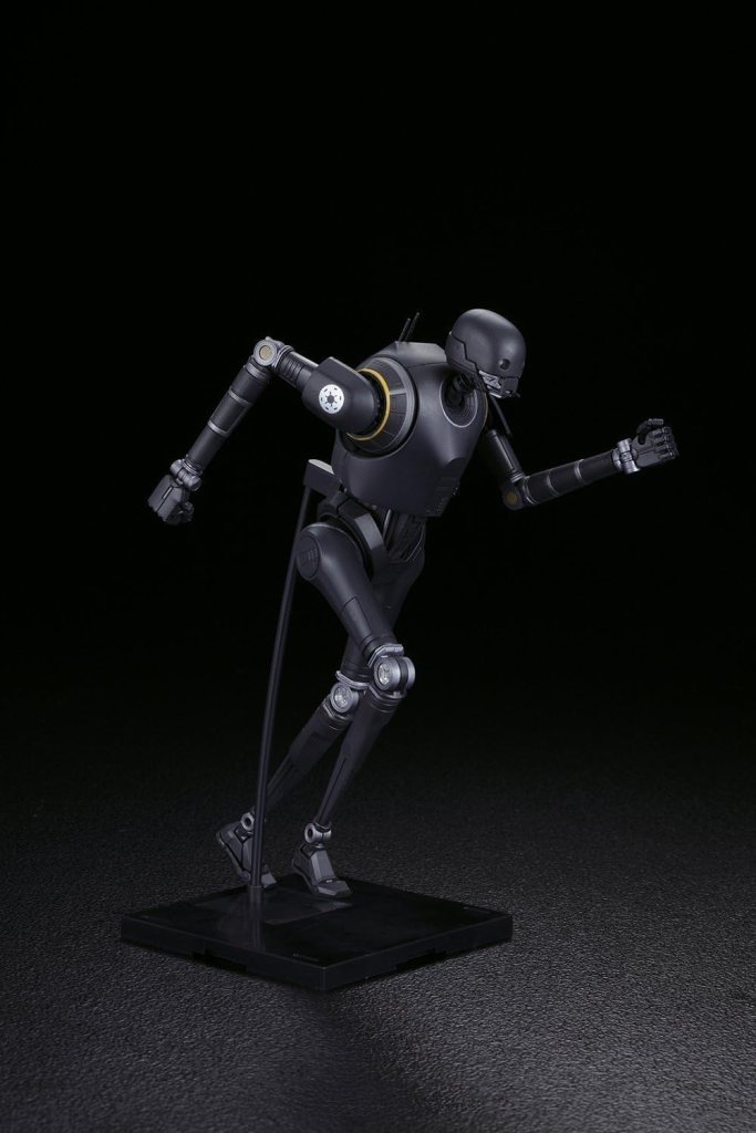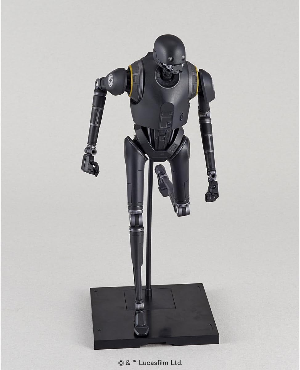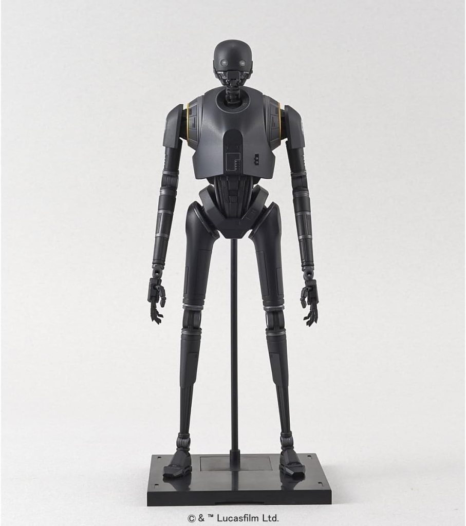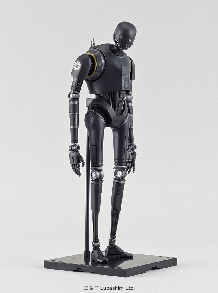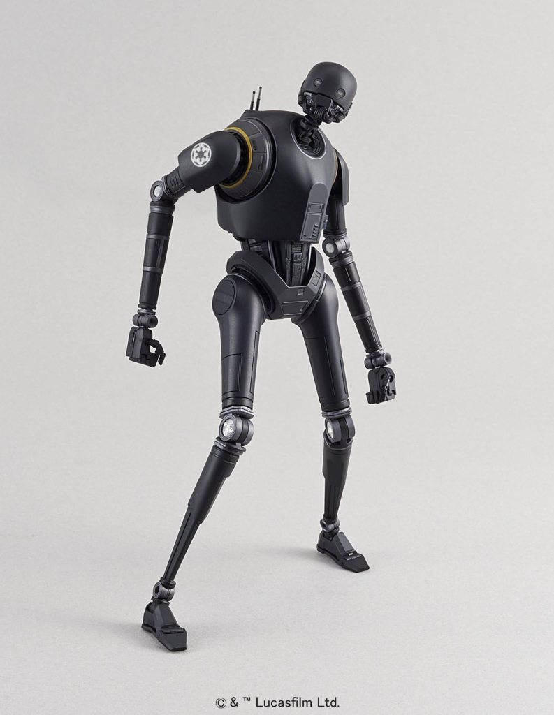 Modellbausatz des Droiden K-2SO aus „Rogue One: A Star Wars Story“ im Maßstab 1:12 von Bandai. Der Bausatz enthält insgesamt 131 Bauteile sowie 27 Decals, sowohl selbstklebend als auch als Nassschiebebilder. Die fertige Figur ist artikuliert uns lässt sich wie eine Actionfigur in verschiedenen Posen darstellen. Außerdem enthalten sind austauschbare Hände und eine Standplatte mit Stativ.