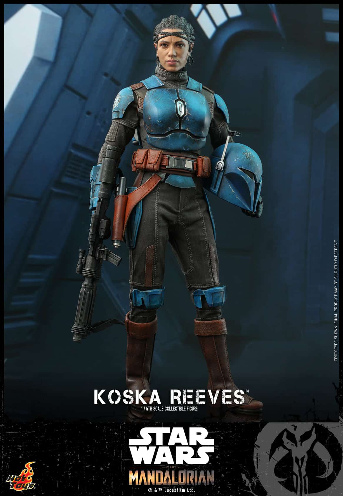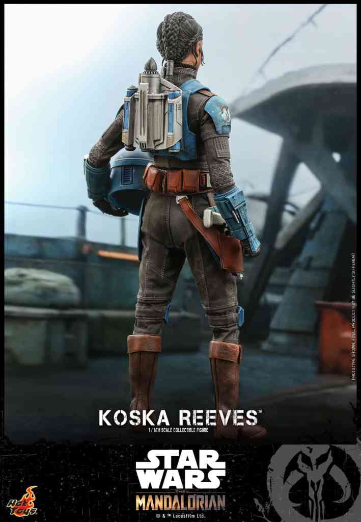 The Koska Reeves collectible figure features newly developed head sculpt with great likeness and detailed hair sculpture, Mandalorian helmet and armor with weathering effects, skillfully tailored under-suit, a jetpack with booster fire effects, a blaster rifle, a blaster pistol, a wired grappling hook, a flamethrower effect, a themed display stand, and backdrop!