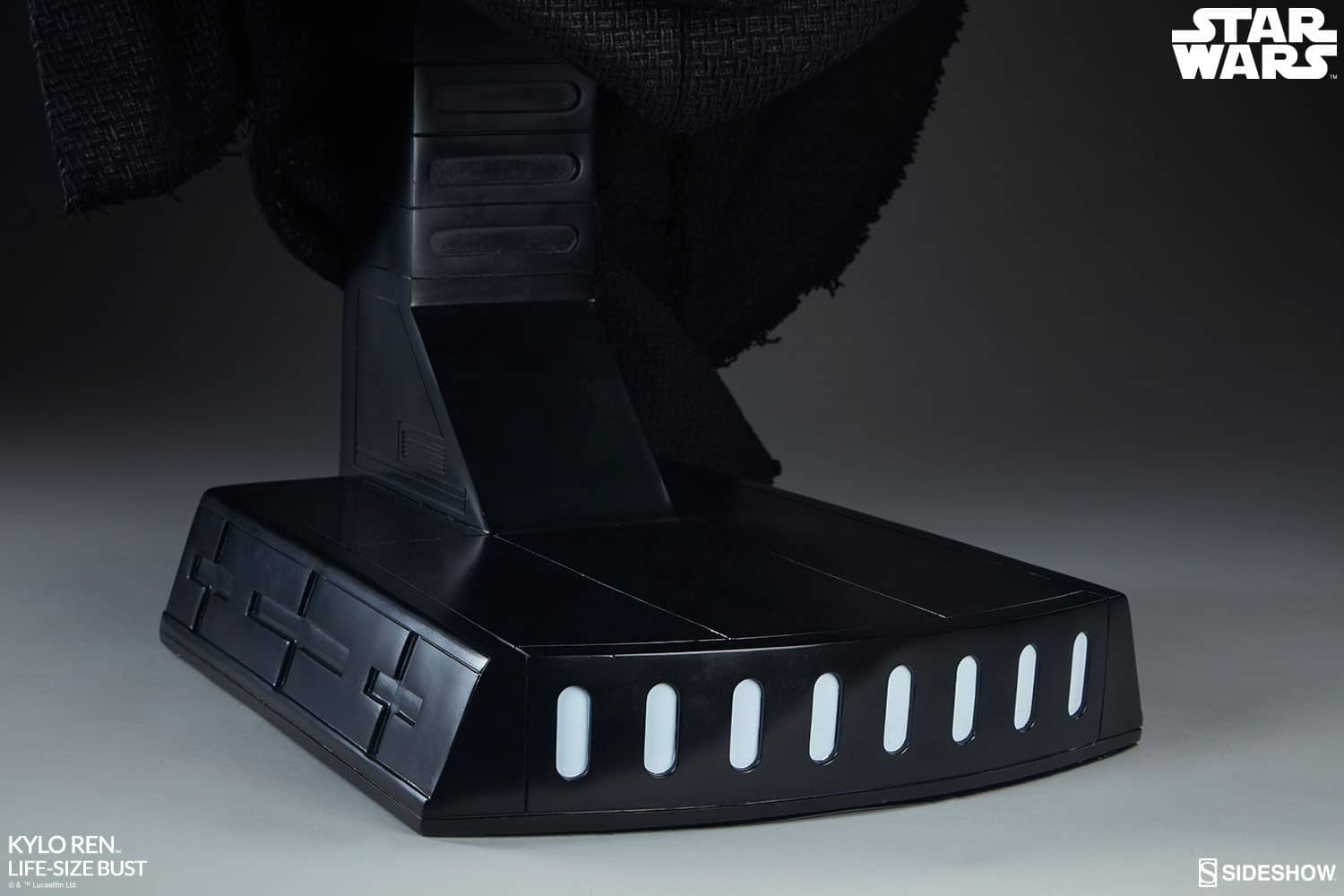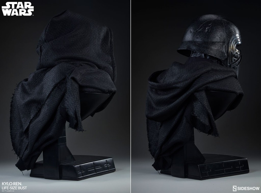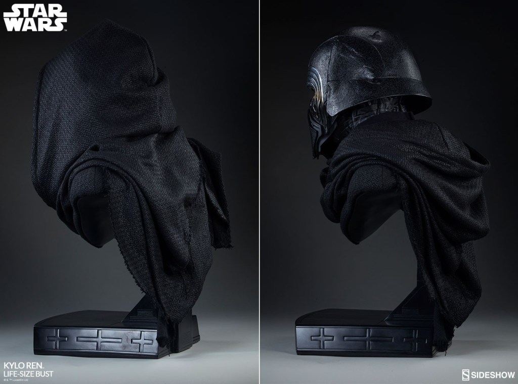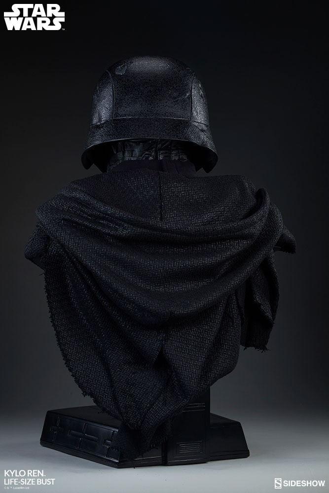 Kylo Ren has tailored fabric garments, with the textured material forming the hood and cloak at his shoulders. The Kylo Ren Life-Size Bust can be displayed with the hood up or down, allowing you to customize your ultimate Star Wars display.