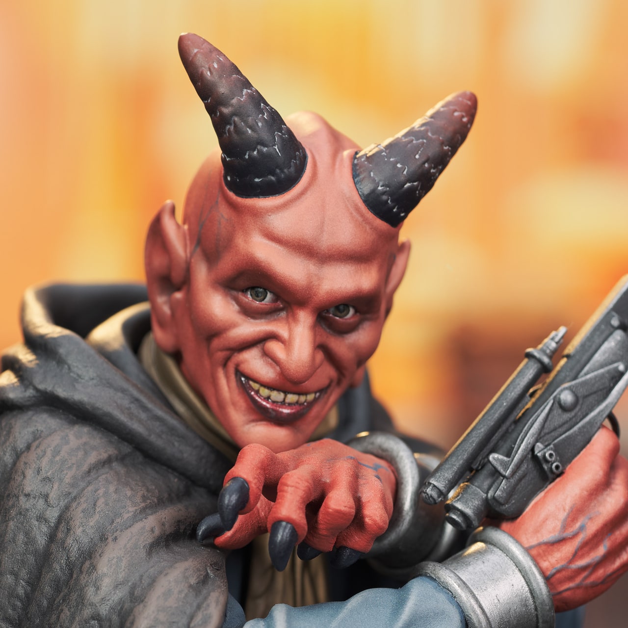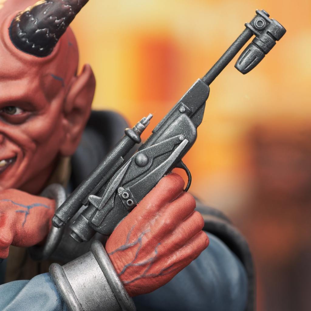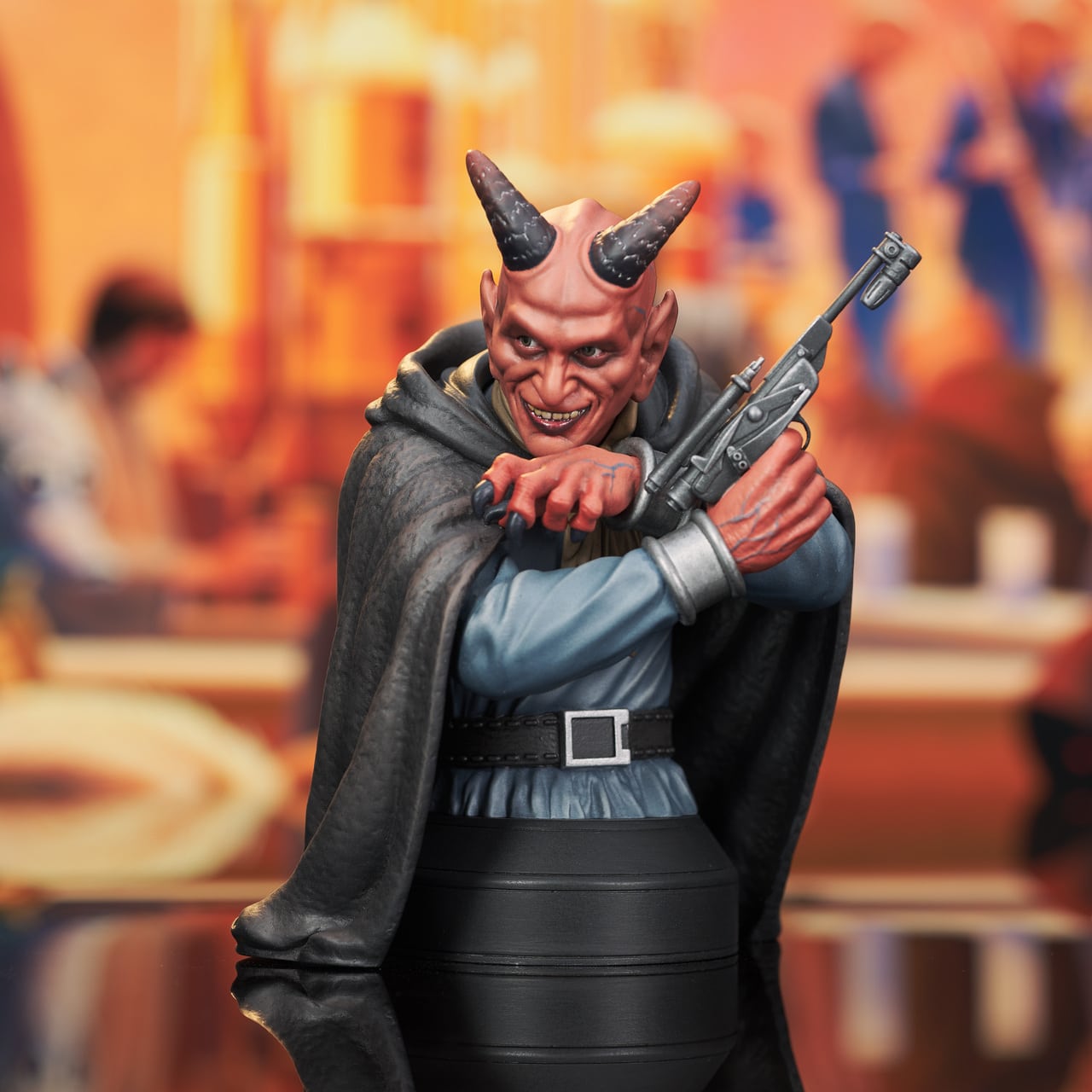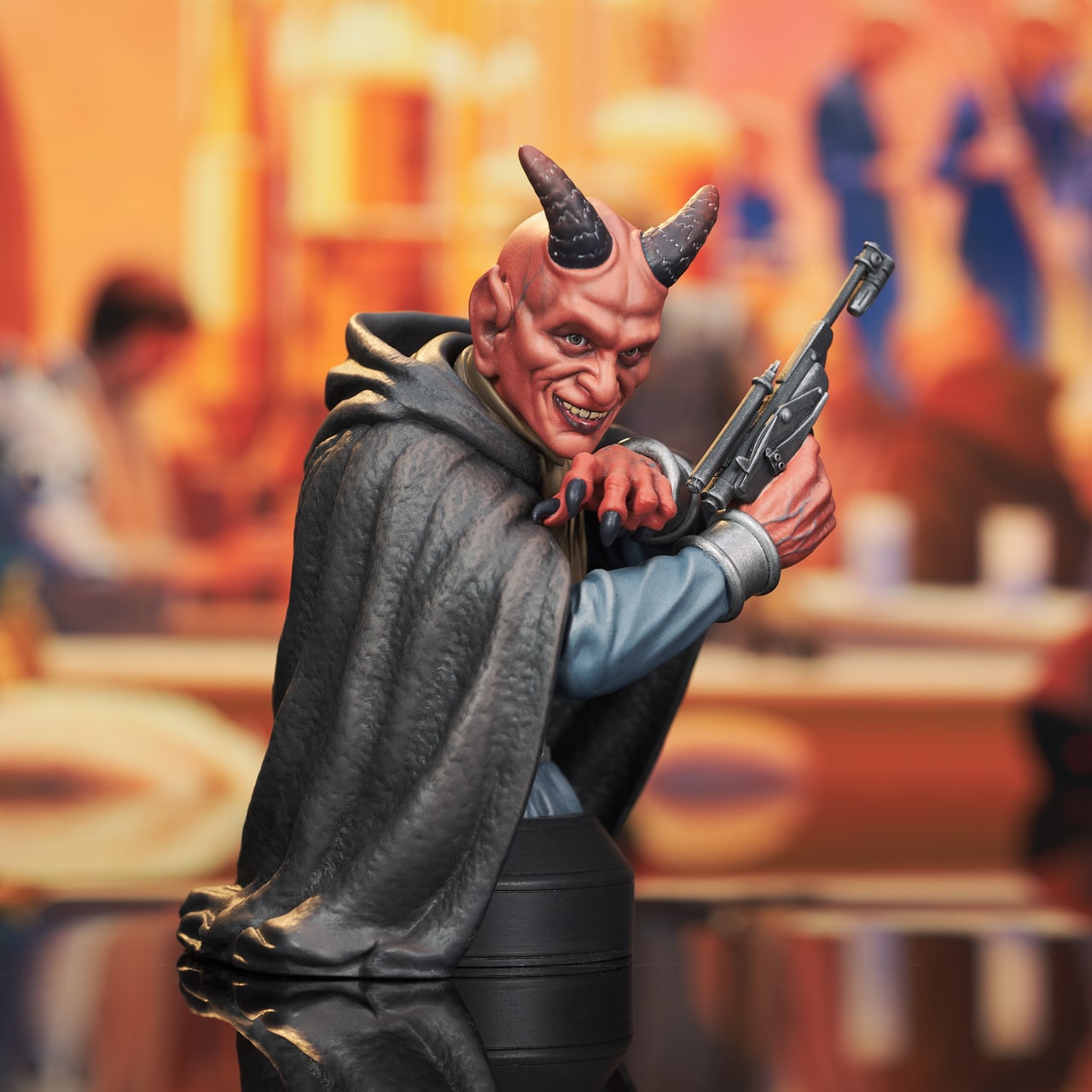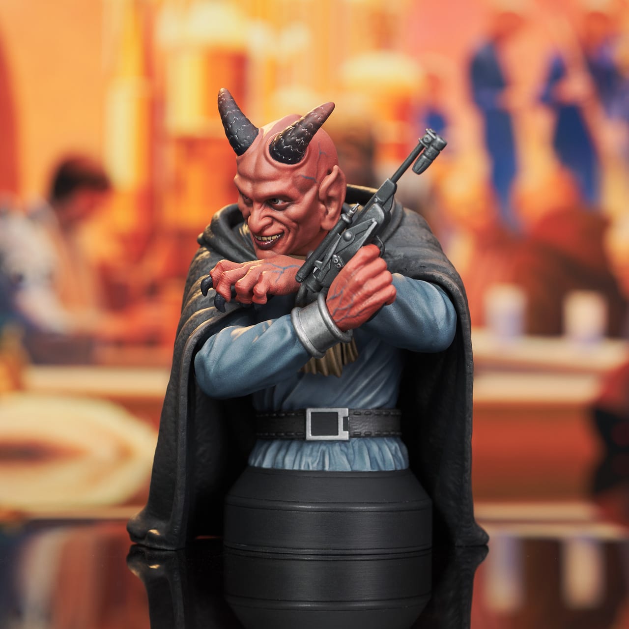 A Gentle Giant Ltd. release! An expatriate from the jungle planet of Devaron, Kardue’sai’Malloc (a.k.a. Labria) was one of the diverse clientele at the cantina in Mos Eisley. Now he’s the latest 1/6 scale bust from Gentle Giant Ltd! This web exclusive depicts the devilish customer in his cape, blaster raised, and stands approximately 7 inches tall. It comes packaged in a full-color box with a hand-numbered, limited-edition certificate of authenticity.