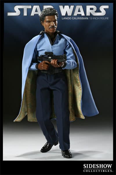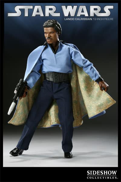 Authentic likeness of Billy Dee Williams as Lando, Shirt, Pants, Lined cape, Shoes, Detailed belt, Imperial Blaster, Rebel Blaster, Lobot wrist controller, Two sets of interchangeable hands, 12-inch Figure Display Base with Star Wars Logo.