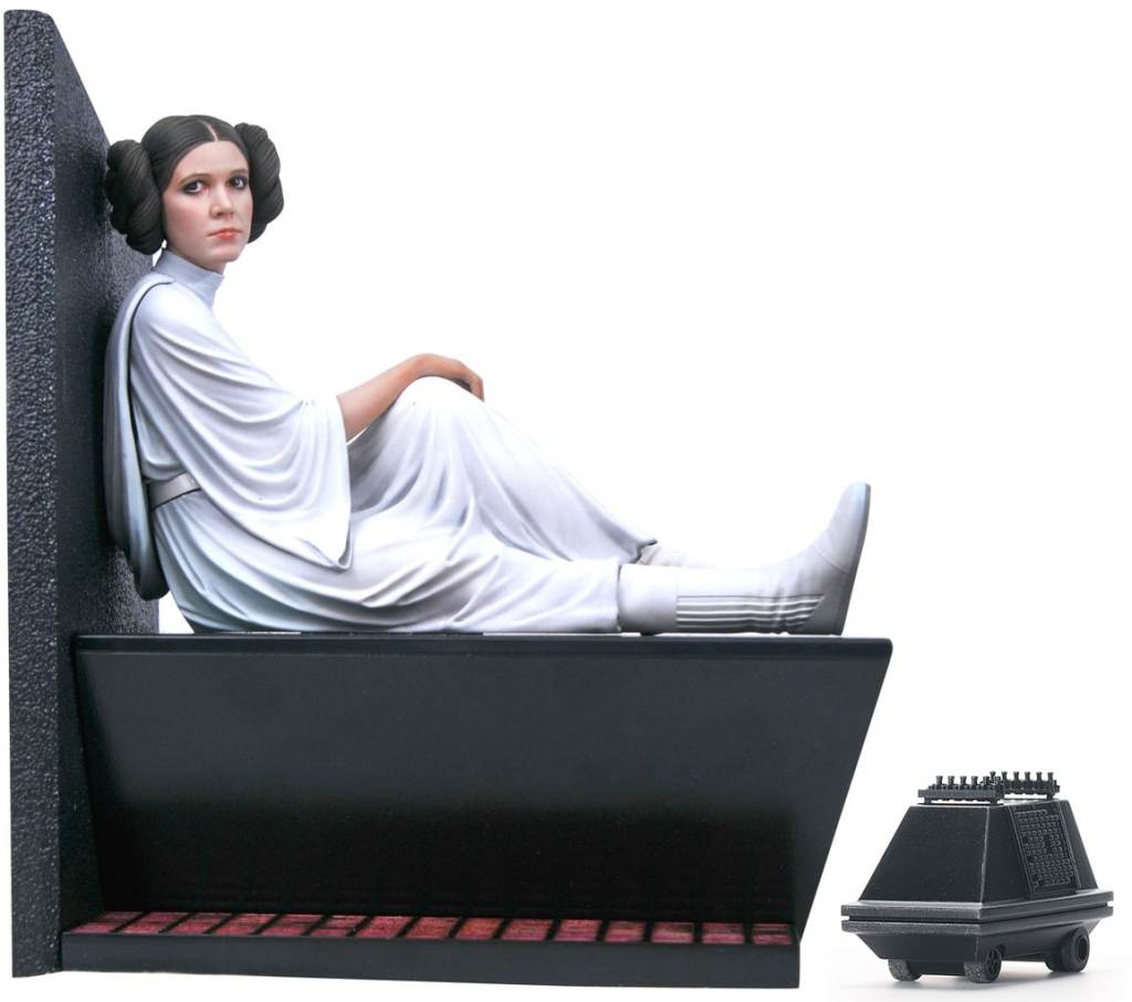 A Gentle Giant Ltd. release! Princess Leia Organa of Alderaan is held prisoner on the Death Star in this 1/6 scale statue from Gentle Giant Ltd! Wearing her classic white gown and resting on a cell bench, the princess awaits rescue in a scene straight out of Sta Wars: A New Hope. Approximately 10 inches tall, this sculpture features detailed sculpting and paint applications, and is limited to only 1,000 pieces. It comes packaged in a full-color box with a certificate of authenticity. Designed and sculpted by Gentle Giant Ltd.!