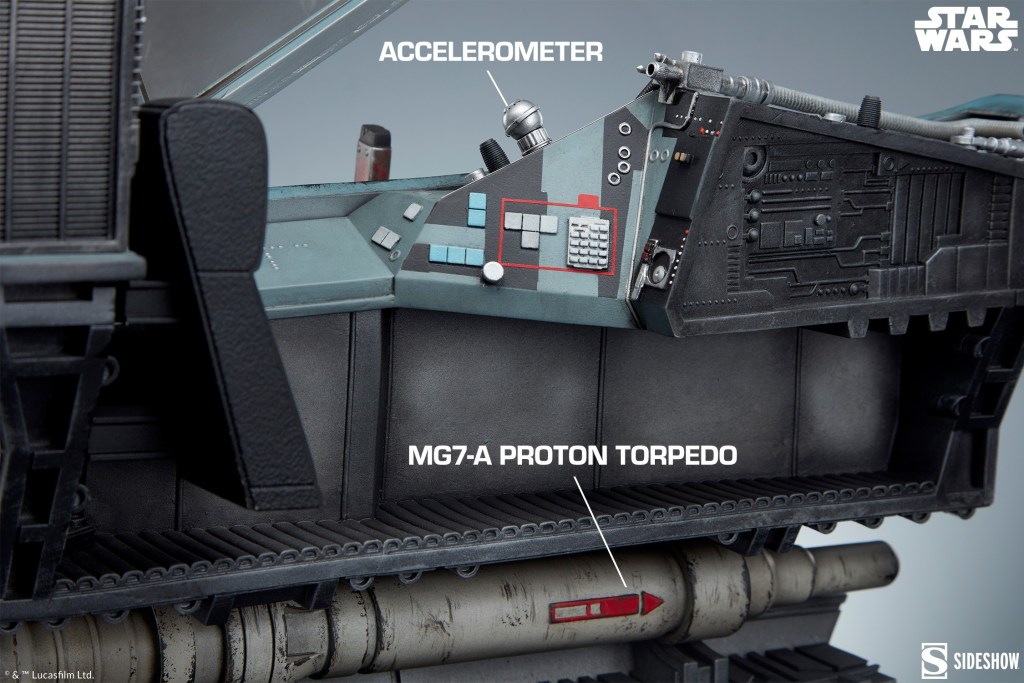 The Luke Skywalker™ & X-Wing: Red Five, Standing By Premium Format™ Figure also features a fully sculpted section of Luke’s T-65B model starfighter attached to the ladder and robust black fuel tubing. No detail has been spared in recreating this section of the ship’s complex armored interior, which starts at the vessel’s nose and includes a portion of the seat, targeting computer, and flight control panels. Reminiscent of the very first X-wing designs in Star Wars, the clear cockpit window can be positioned either raised or down in order to create your ideal display. With this cockpit feature fully extended the statue measures up to 30″ tall. A reinforced internal metal rod supports the entire ship structure — from the interior of the base to the hull — in an incredible, gravity-defying feat.