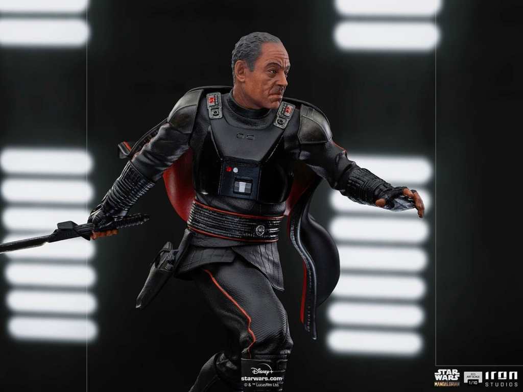 Officer Moff Gideon is an agent for the Imperial Security Bureau, the law enforcement and intelligence arm of the fallen Galactic Empire. Gideon stands at the base of the floor of his light cruiser and advances, wielding the legendary Shadow Saber, the only black lightsaber in the Star Wars canon. The black lightsaber was stolen long ago from the Jedi Temple of Coruscant by Clan Vizsla of Mandalorians and has become a symbol of the Mandalore. Anyone who wields it can claim the Mandalorian throne. In his black imperial uniform covered in a cape, with a blaster pistol on his hip, Iron Studios presents the feared „Moff Gideon BDS Art Scale 1/10 – The Mandalorian – Iron Studios“.