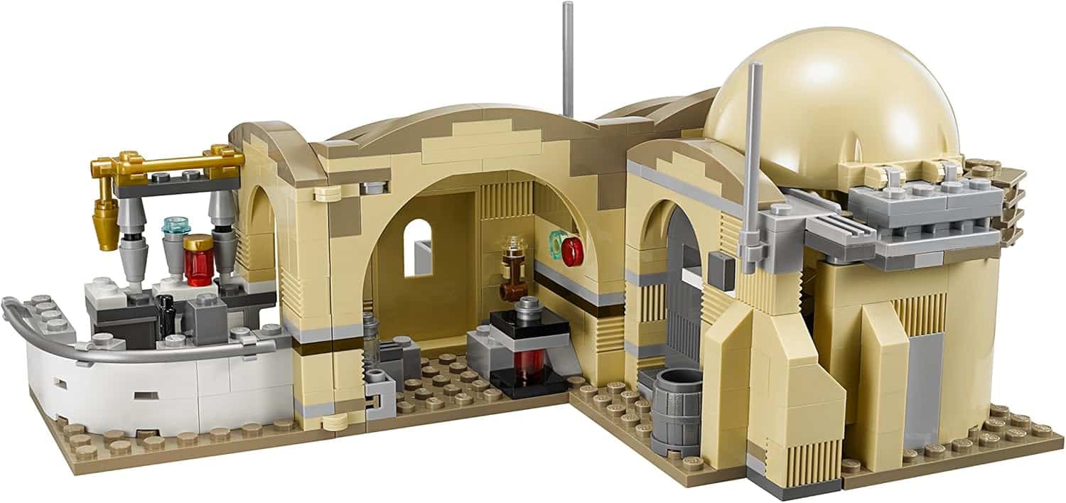 • Die Mos Eisley Cantina™ verfügt über ein Kuppeldach, Eingang mit Schiebetür und Droiden-Scanner, Dach zum Öffnen, herausschiebbare Böden zu den mittleren Räumen, Bar mit Regalen, Geld und Flaschen, Bühne für die Bith Band, Sitze, Tische und Fenster