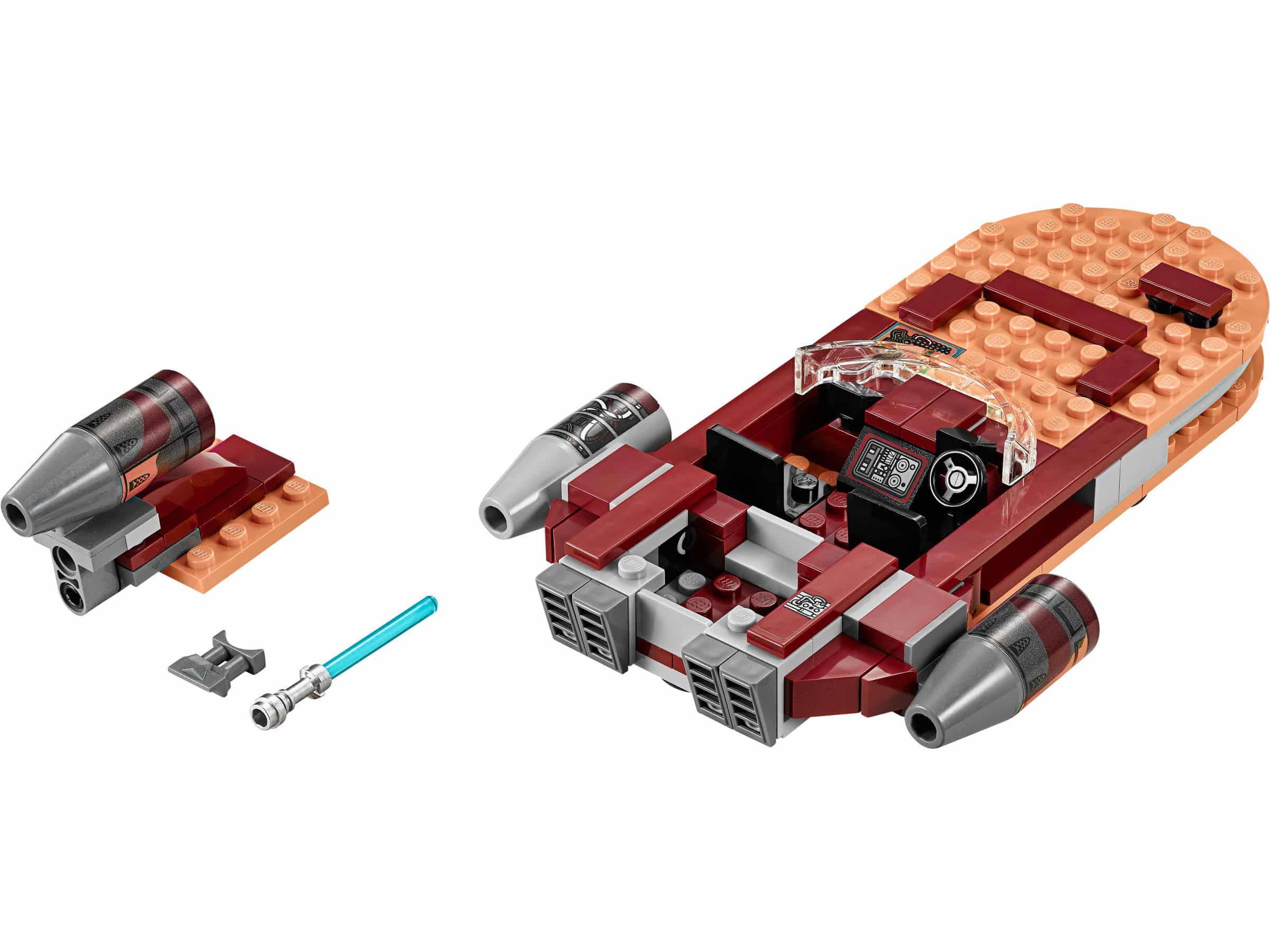 • Der Landspeeder ist mit einem Doppel-Cockpit, Windschutzscheibe, 3 großen Maschinen und Gepäckfach ausgestattet