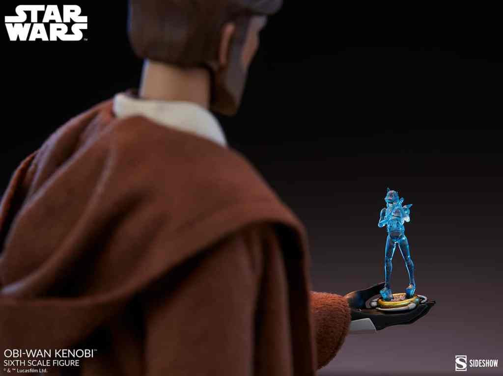 The Obi-Wan Kenobi Sixth Scale Figure includes a number of stylized hands and swap-out accessories to give collectors a wide range of display options for the Jedi general. Obi-Wan Kenobi comes with four pairs of stylized hands including a pair of grip hands, a pair of neutral hands, a pair of force hands, and a pair of fists for a wide variety of gestures and pose combinations. In addition, he comes with both a lightsaber hilt and lightsaber with its blue tapered blade unleashed for battle action. Finally, Obi-Wan includes a holoprojector accessory with a sculpted Commander Cody™ hologram for communicating with the loyal Clone Trooper.