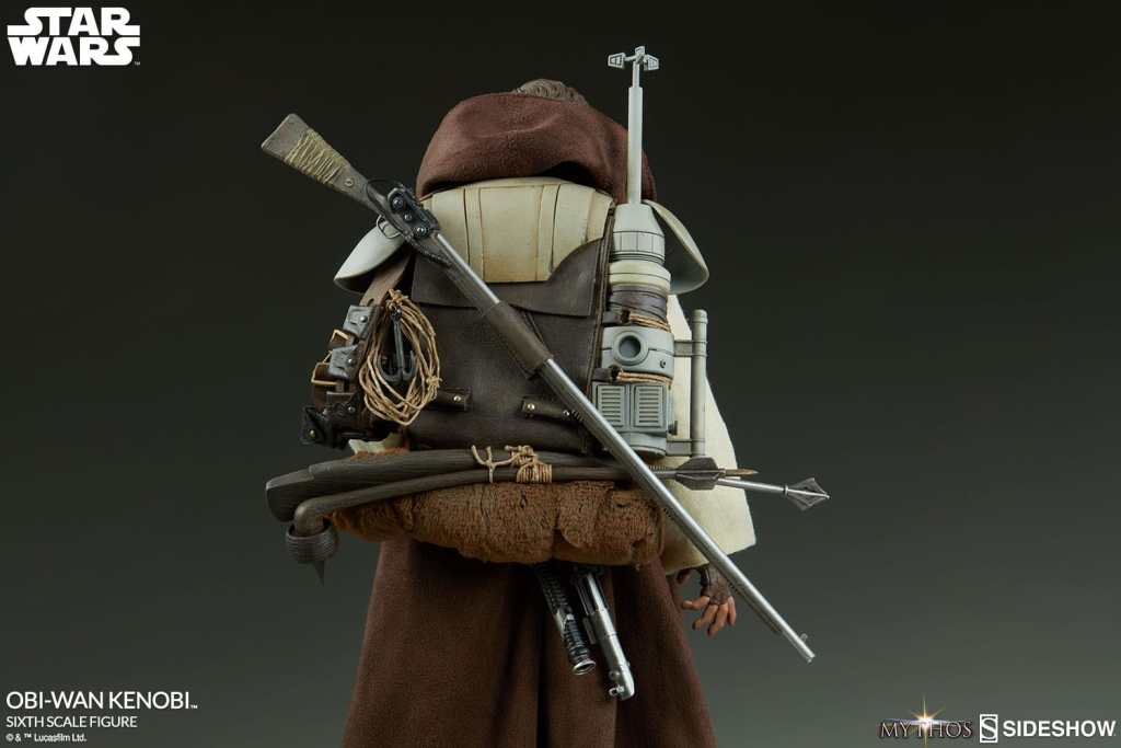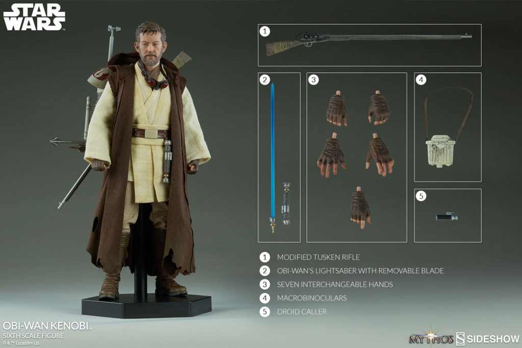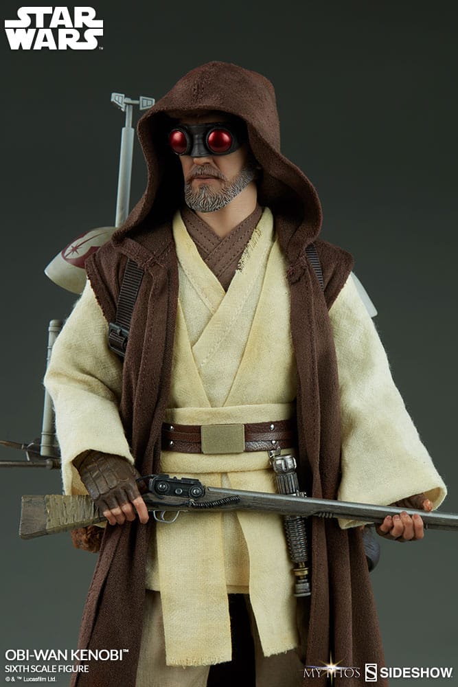 The Obi-Wan Kenobi Sixth Scale Figure comes equipped with a modified Tusken rifle and 2 gaffi sticks, and technology necessary for survival such as a portable moisture vaporator, a grappling hook, a droid caller, and macrobinoculars. Obi-Wan also has goggles and Clone Wars armor as remnants of his noble past.