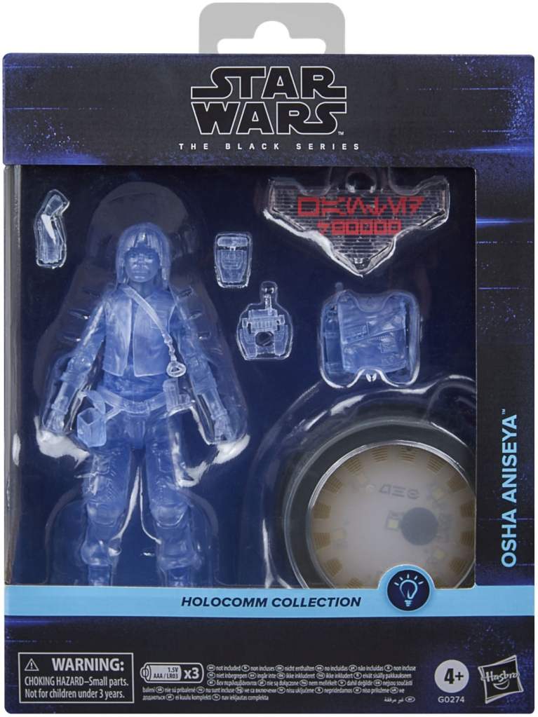 Receive transmissions from across the galaxy with THE BLACK SERIES Holocomm collection, featuring light-up holopucks. STAR WARS fans and collectors can display this premium 6-inch STAR WARS: THE BLACK SERIES OSHA ANISEYA figure featuring premium detail, multiple points of articulation and hologram-style deco in their collections. Press the button on the puck to light up the bottom and illuminate the figure. Press and hold the button to activate a 30-minute light display! This collectible figure includes a bounty chip with an Aurebesh inscription, a holopuck, two droid accessories, a backpack, and a blaster! Look for more Holocomm Collection figures to build a galactic communication hub on your shelf! (Each sold separately. Subject to availability) Requires 3 AAA batteries, not included.