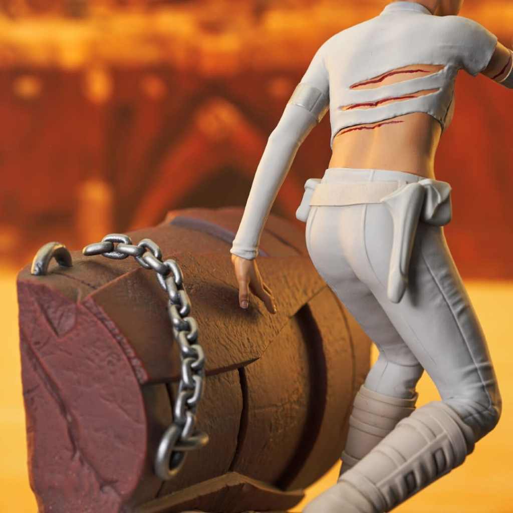 All hail the Queen! Nabooan queen-turned-Senator Padme Amidala charges into battle in this new Premier Collection sculpture from the artists at Gentle Giant Ltd.! Wielding a blaster as she escapes from her chains in the arena on Geonosis, this statue of Padme features the likeness of Natalie Portman and stands approximately 9 inches tall. Limited to only 3000 pieces, it comes packaged in a full-color window box with a numbered certificate of authenticity.