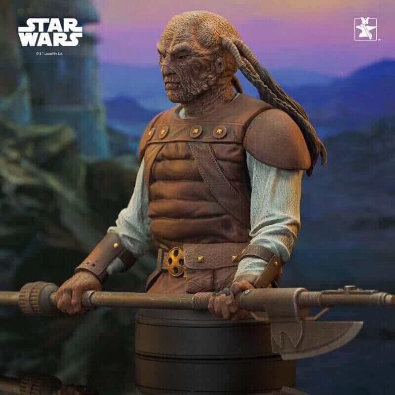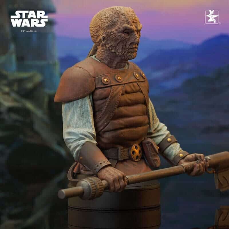 A member of the Weequay people, Pagetti Rook served Jabba the Hutt as a skiff guard, but little was known about him until after his death at the hands of Luke Skywalker and his allies. Armed with his BD-1 Cutter vibro-ax, Rook is now the latest 1/6 scale mini-bust, standing approx. 18 cm tall. Exclusive to Premier Guild members, it comes packaged with a certificate of authenticity in a full-color box. Limited to 2000 pieces.