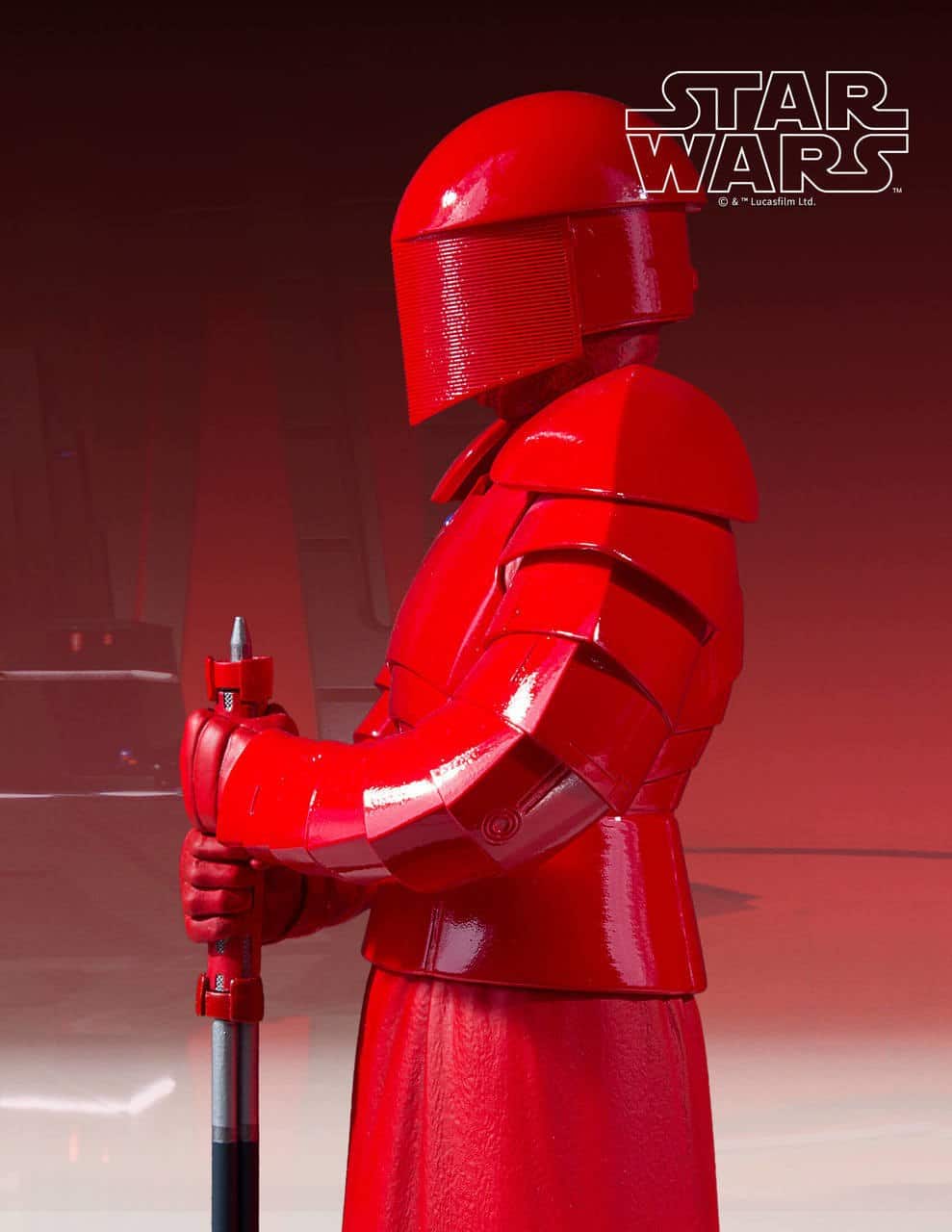 The Praetorian Guard were an elite squad of First Order warriors assigned to guard Supreme Leader Snoke. There were eight sentinels that were divided into four pairs and each pairing had a different helmet and unique weapons. These crimson armored warriors are reminiscent of the Emperor’s Royal Guard, but unlike those stoic sentinels these elite fighters spring into action when their master is threatened. This particular guard is armed with a Bilari Electro-Chain Whip. An electro-plasma filament is threaded through the whip’s articulated segments and houses enough power to kill an opponent. The whip, at rest, is solid like a staff and can be used like a bludgeon in combat.