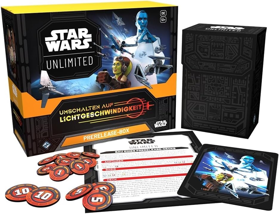 Eine Star Wars: Unlimited – Umschalten auf Lichtgeschwindigkeit Prerelease-Box enthält: