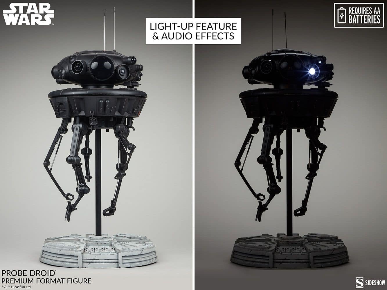 Inspired by the appearance of the Imperial Probe Droid in Star Wars Episode V: The Empire Strikes Back™, the Probe Droid Premium Format Figure includes light-up eyes* and rotating legs that increase the scope of its sinister espionage activities. This Star Wars figure additionally features a speaker box that plays transmission sound effects from the film, making it a fully immersive addition to your display.
