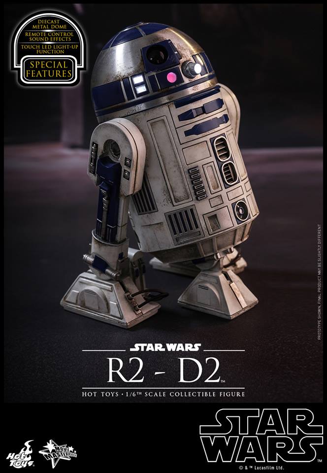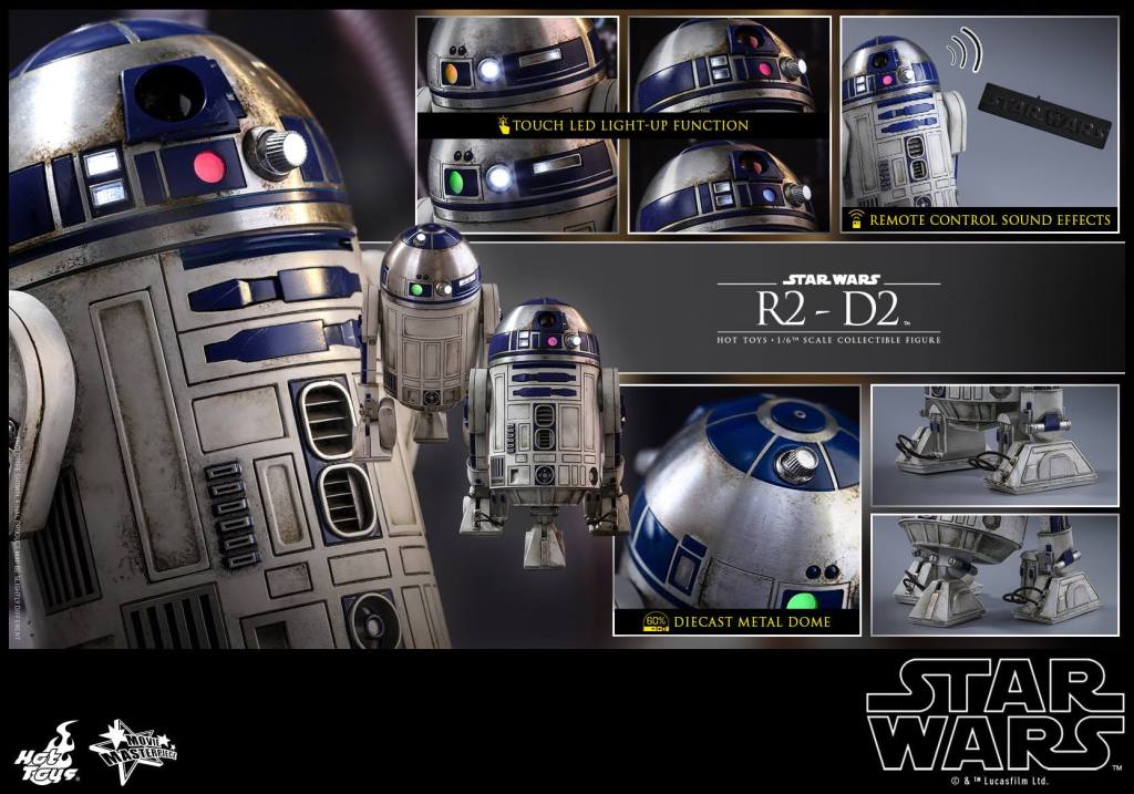 The astonishing collectible figure is specially crafted based on the appearance of R2-D2 in Star Wars: The Force Awakens. It features a meticulously crafted diecast metal dome, touch LED light-up functions, highly detailed mechanical construction with weathering effects, and remote controlled sound effect function featuring 12 iconic R2-D2 sounds!
