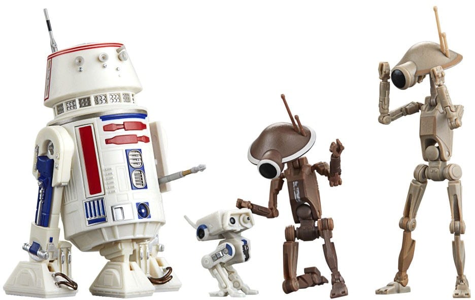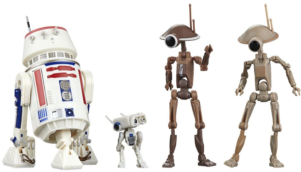 STAR WARS  fans and collectors can imagine scenes from the STAR WARS galaxy with this premium 6-inch scale STAR WARS: THE BLACK SERIES R5-D4, BD-72 & PIT DROIDS 4-pack, inspired by the characters’ appearances in STAR WARS: THE MANDALORIAN. Peli Motto makes quick work of refueling and repairing battered ships with the help of R5-D4, BD-72 and a team of hyperactive pit droids. The characters included in the pack include R5-D4, BD-72 and a pair of pit droids. Fans and collectors can display these articulated figures featuring premium detail and multiple points of articulation in their collection. Includes 4 figures and 7 entertainment-inspired accessories including tools and removable jet thrusters for R5-D4.