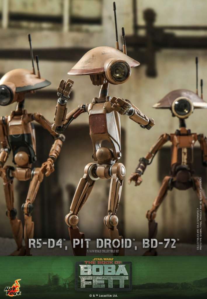 Standing at approximately 20cm tall for R5-D4, 22cm tall for the Pit Droid, and 8cm for BD-72, the three droids are crafted with exceptional mechanical details. They also feature weathered paint applications and great articulations.