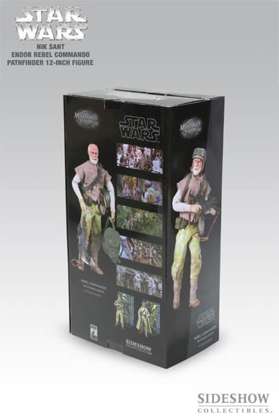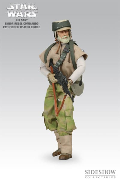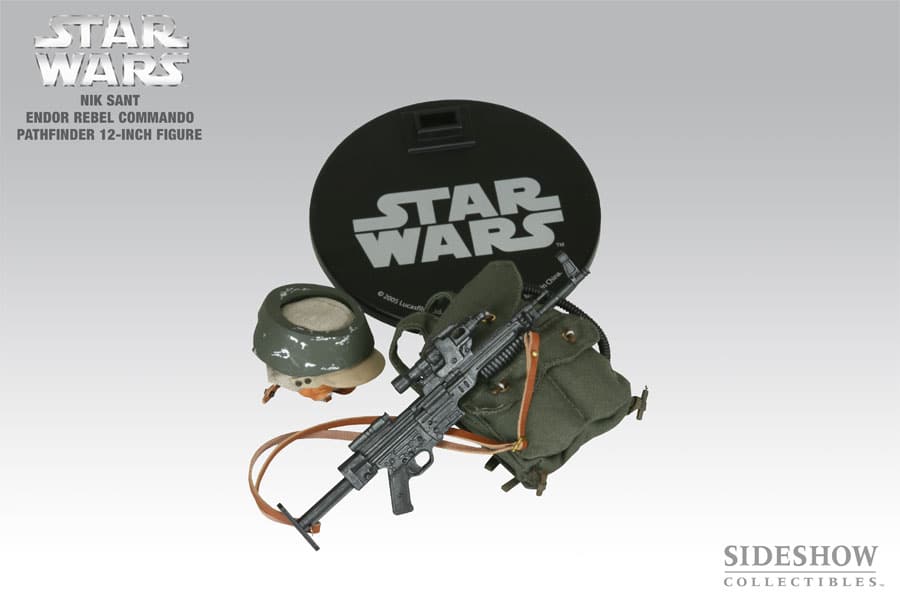 The 12-inch Nik Sant – Endor Rebel Commando Pathfinder figure includes: