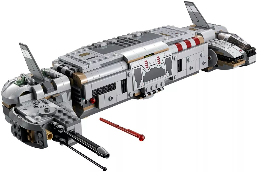 Der Resistance Troop Transporter erweist wertvolle Dienste als Truppentransporter und verfügt über aufklappbare Luken, eine absenkbare Rampe, Doppelraketen und Platz für die 4 im Set enthaltenen Minifiguren.