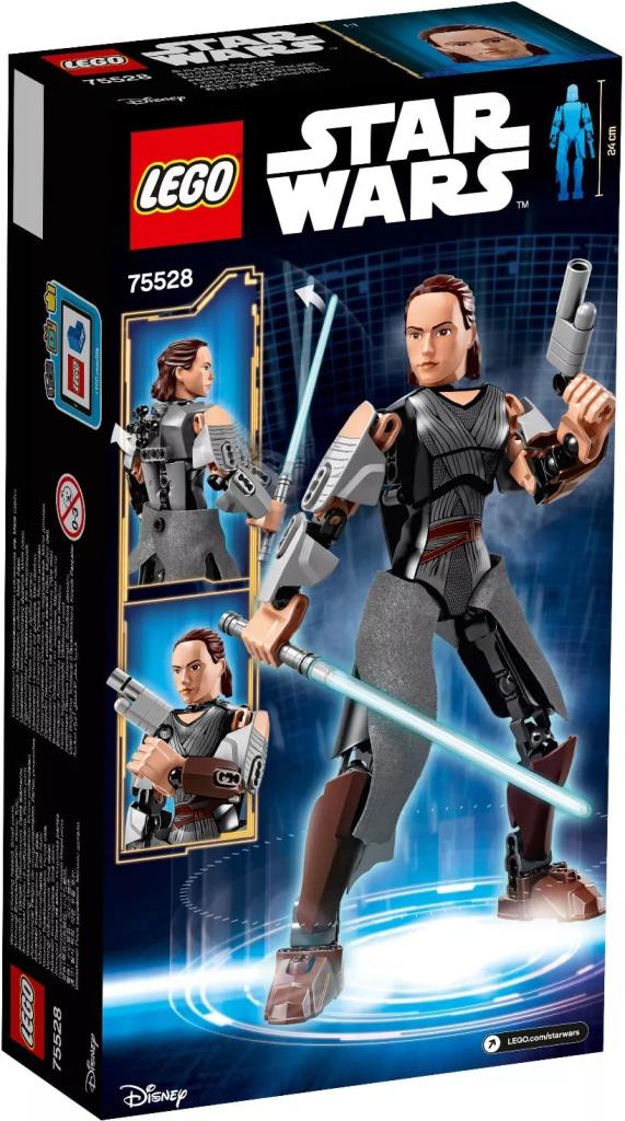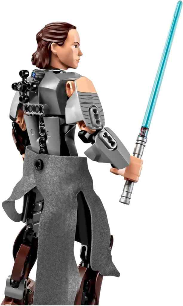 - Die baubare und äußerst bewegliche Figur verfügt über Textilbesätze, Verzierungen auf der Brust und an den Armen und eine neue Kopfkonstruktion, die im September 2017 herauskommt. Um spannende Action-Abenteuer erleben zu können, ist Rey mit einem blauen Lichtschwert, einer Blaster-Pistole und einer radbetätigten Funktion zum Schwingen der Arme ausgestattet.