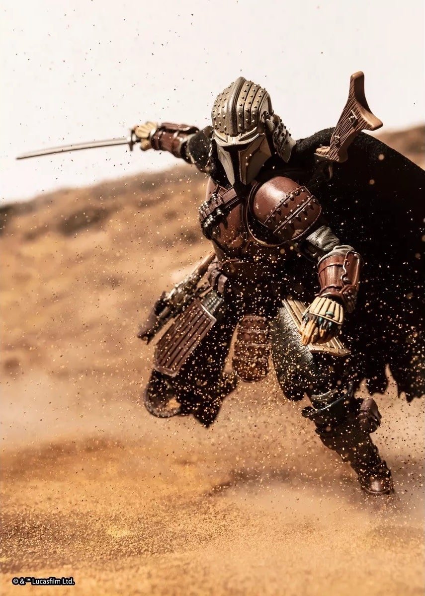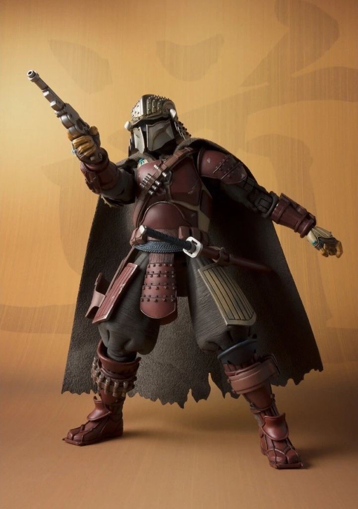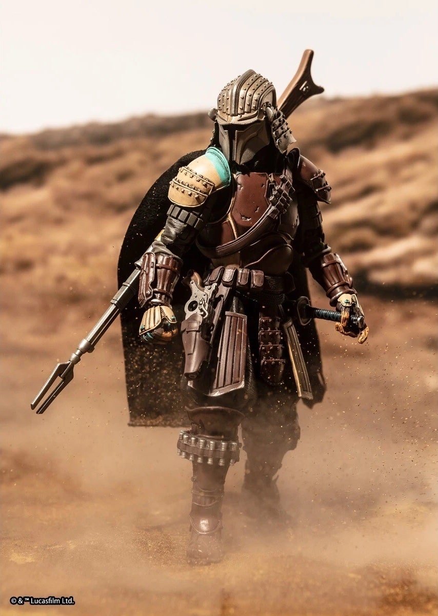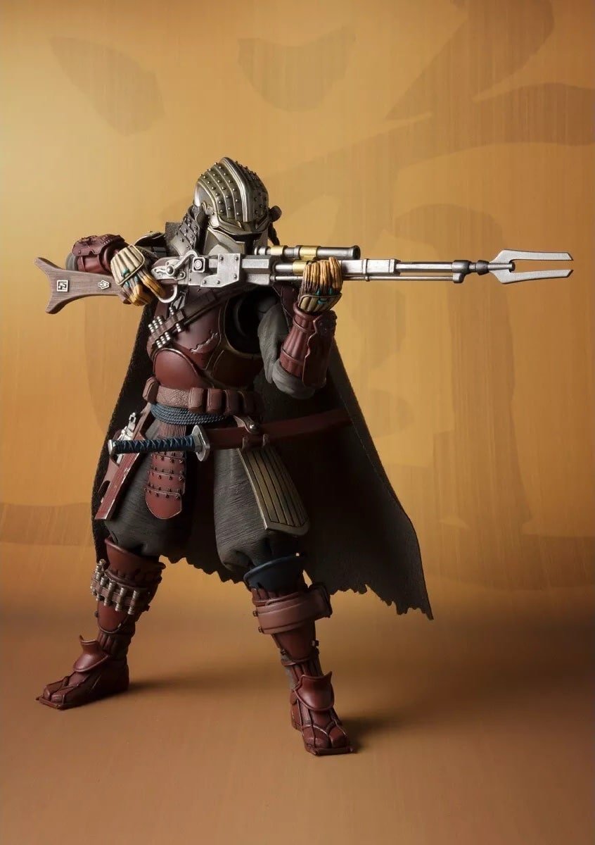 The Mandalorian arrives in the Meisho Movie Realization series in the first armor seen in the Star Wars series The Mandalorian. Styled by Takayuki Takeya and inspired by the motif of a ronin (masterless samurai), this figure includes the first ever cloth cape in the Meisho series. He also includes his characteristic rifle and blaster accessories, as well as a katana sword. With weathering and brushing applied to his armor plating this figure brings a new level of detail to the line.