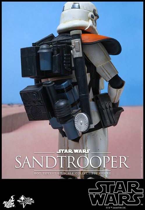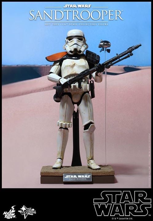 The highly-accurate Sandtrooper collectible figure is specially crafted based on the image of the Squad Leader on Tatooine. The specialized trooper features a meticulously crafted Sandtrooper armor and helmet with signature weathering effects, a highly detailed survival backpack, 3 types of blasters, a Patrol Droid as seen in the Special Edition of the film, and a specially designed desert-themed figure stand.