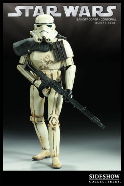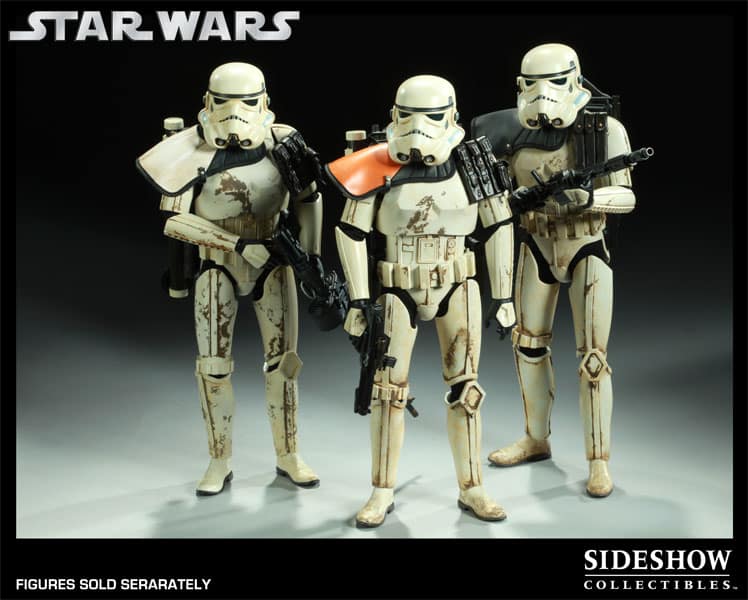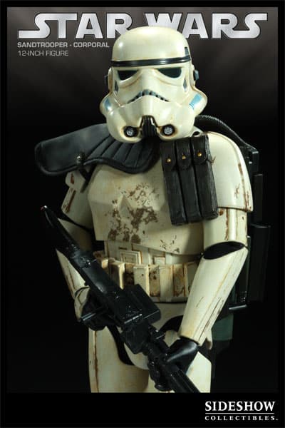 The sandtrooper is a desert terrain stormtrooper. Sandtroopers are largely identical to standard stormtroopers except they have additional training in specialized areas. Their armor consists of an 18-piece anti-blaster cocoon shell with heat-reflective coating worn over a temperature-control body glove. The sandtrooper helmet features automatic polarized lenses, a built-in comlink and breathing filters. These stormtroopers are specifically designed for high temperature environments. Instead of depending on machinery that may not function in hostile environments, sandtroopers make use of local creatures for transportation.