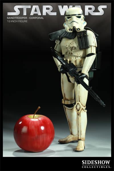 Fully articulated male body (armored body) with 30+ points of articulation, Fully detailed Sandtrooper armor set, featuring helmet faceplate, left shin armor, abdomen armor, and pauldron with black rank designation.