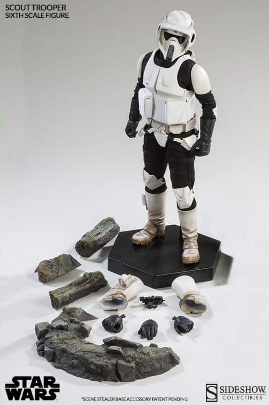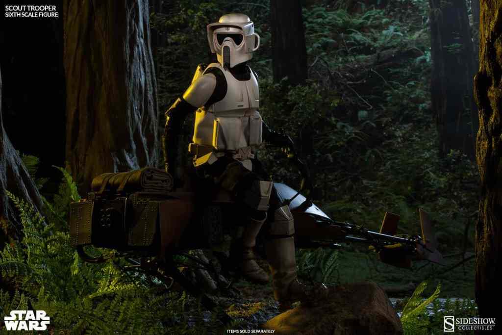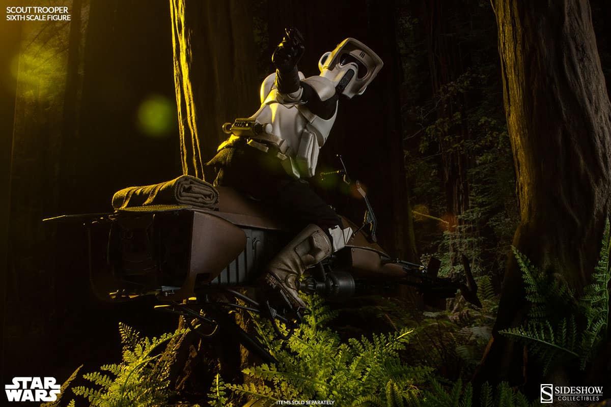 Armed to provide rear-guard cover with their blaster and sniper rifle, the Scout Troopers are trained as efficient survivalists, equipped with lightweight armor, utility belt, sidearm boot holster, and helmets with enhanced macrobinocular view plates for efficient target acquisition. Displayed with a forest terrain base, or piloting the Sixth Scale Imperial Speeder Bike (sold separately), these loyal scouts are ready to be assigned to their post.