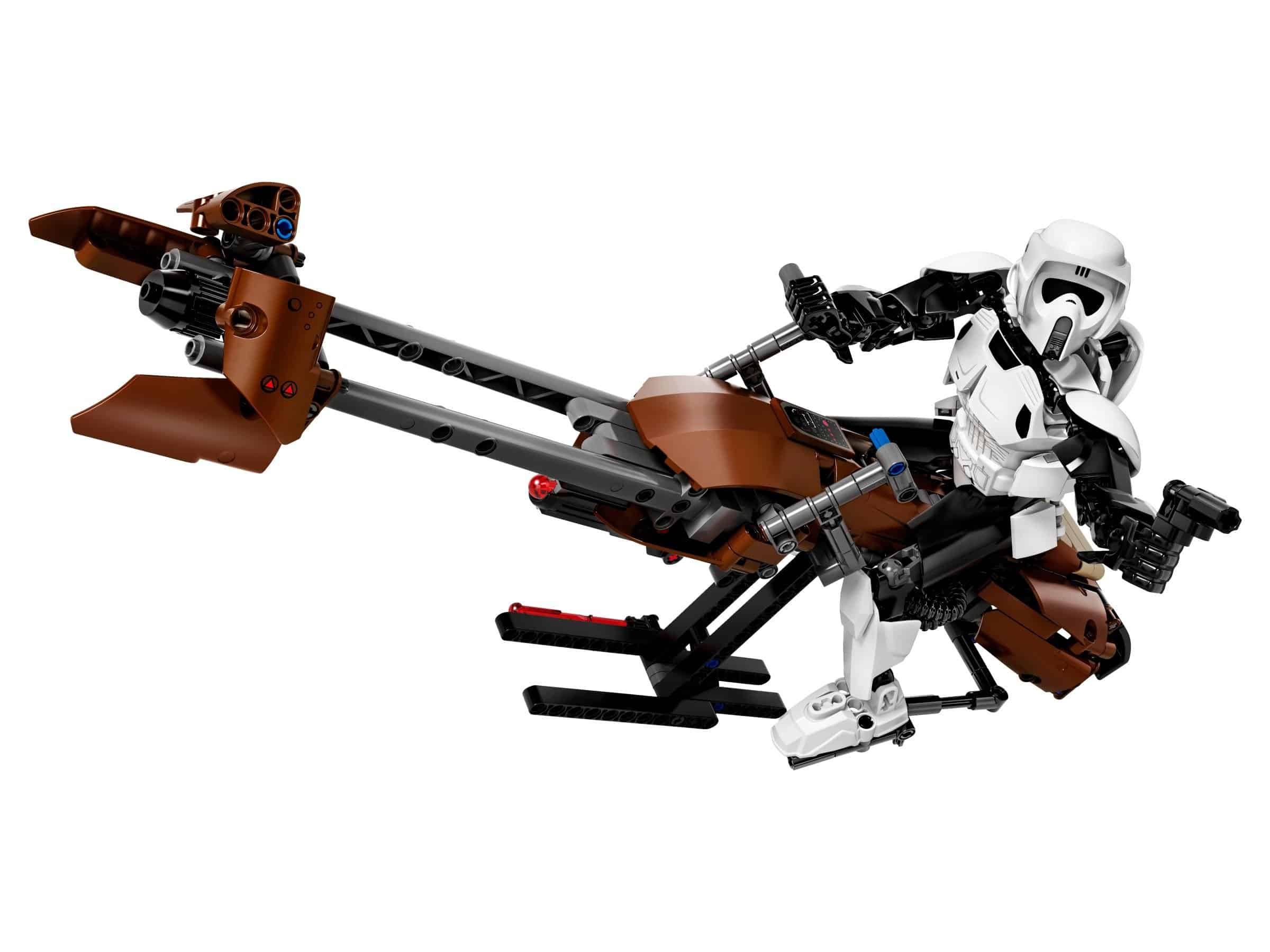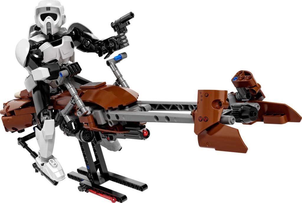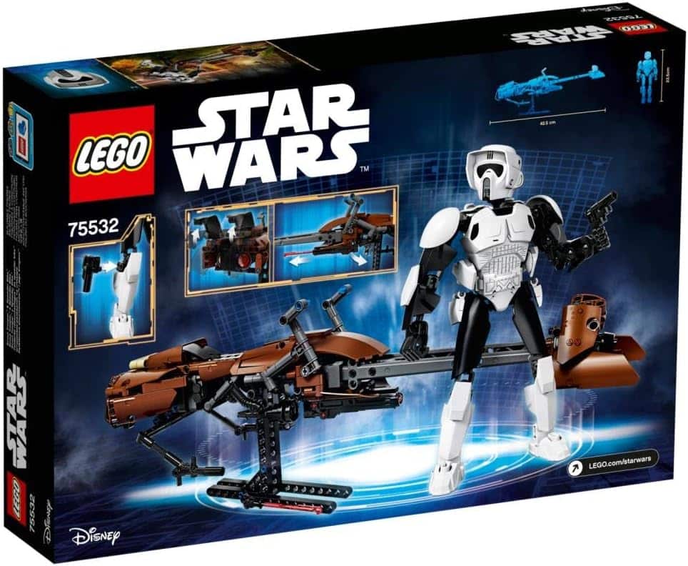 Mit dem LEGO® Star Wars Set „Scout Trooper & Speeder Bike“ erlebst du Star Wars Abenteuer auf einem völlig neuen Niveau. Die baubare und äußerst bewegliche Figur verfügt über eine detailreiche Tasche und einen detailreichen Beutel, einen ikonischen Helm und eine abnehmbare Blaster-Pistole am Bein. Zum ersten Mal enthält ein Figurenset auch ein Fahrzeug, genauer gesagt ein Modell aus LEGO Steinen, mit denen das Speeder Bike aus „Star Wars: Episode VI – Die Rückkehr der Jedi-Ritter“ detailgetreu nachgebildet wird. Das Bike verfügt über einen federunterstützten Shooter, einen Lenker und Fußstützen, an denen der Scout Trooper befestigt werden kann, bewegliche Klappen, detailreiche Blenden und einen Haltegriff unter dem Modell, der ein besseres Spielerlebnis bietet und auch als Ständer dienen kann.