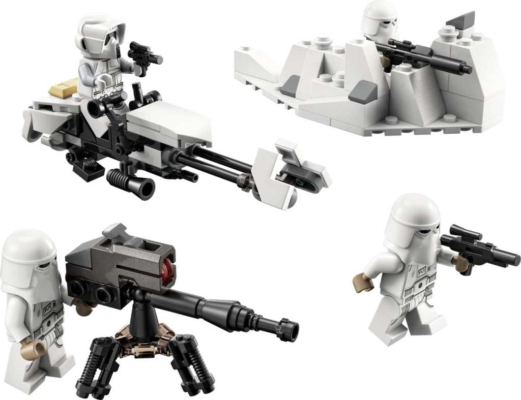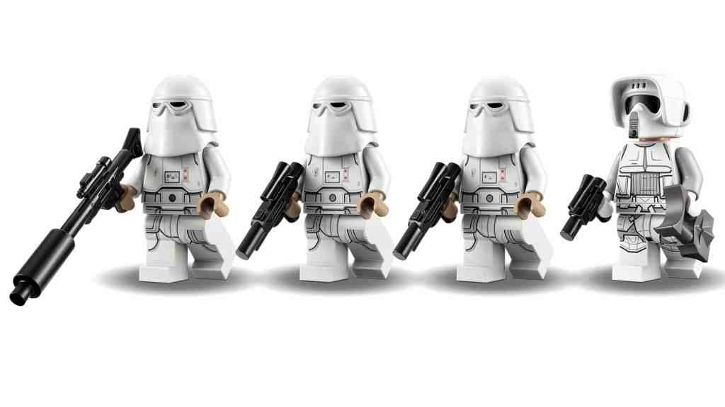 - 4 LEGO® Minifiguren: Ein Scouttruppler und 3 Schneetruppler mit 2 Blasterkanonen, einem Blastergewehr und einer Blasterpistole