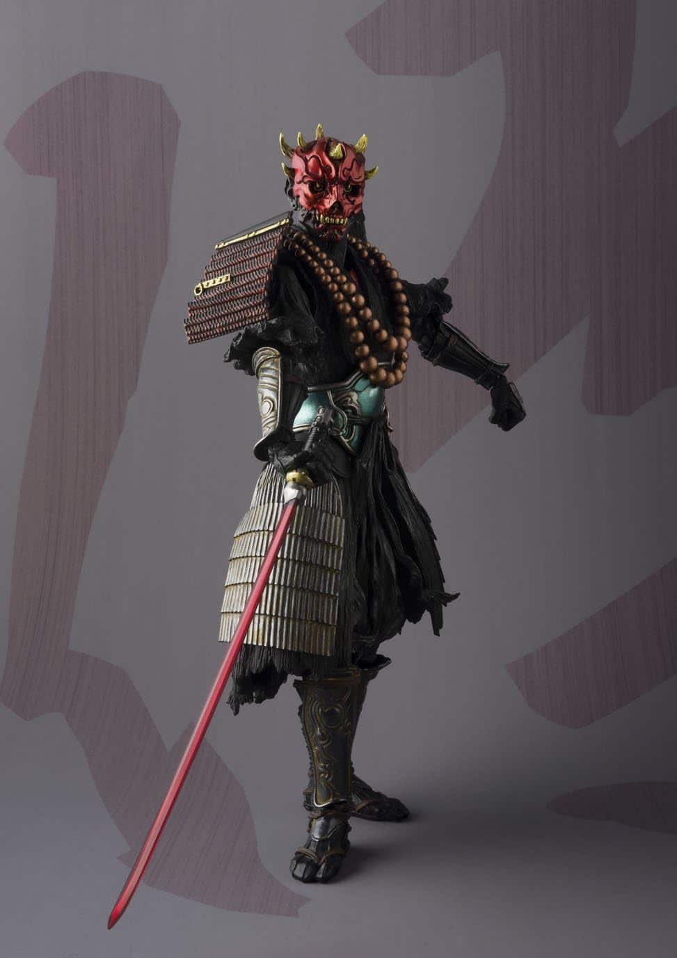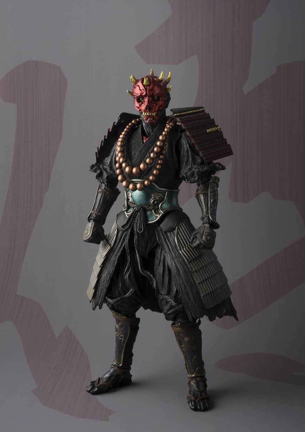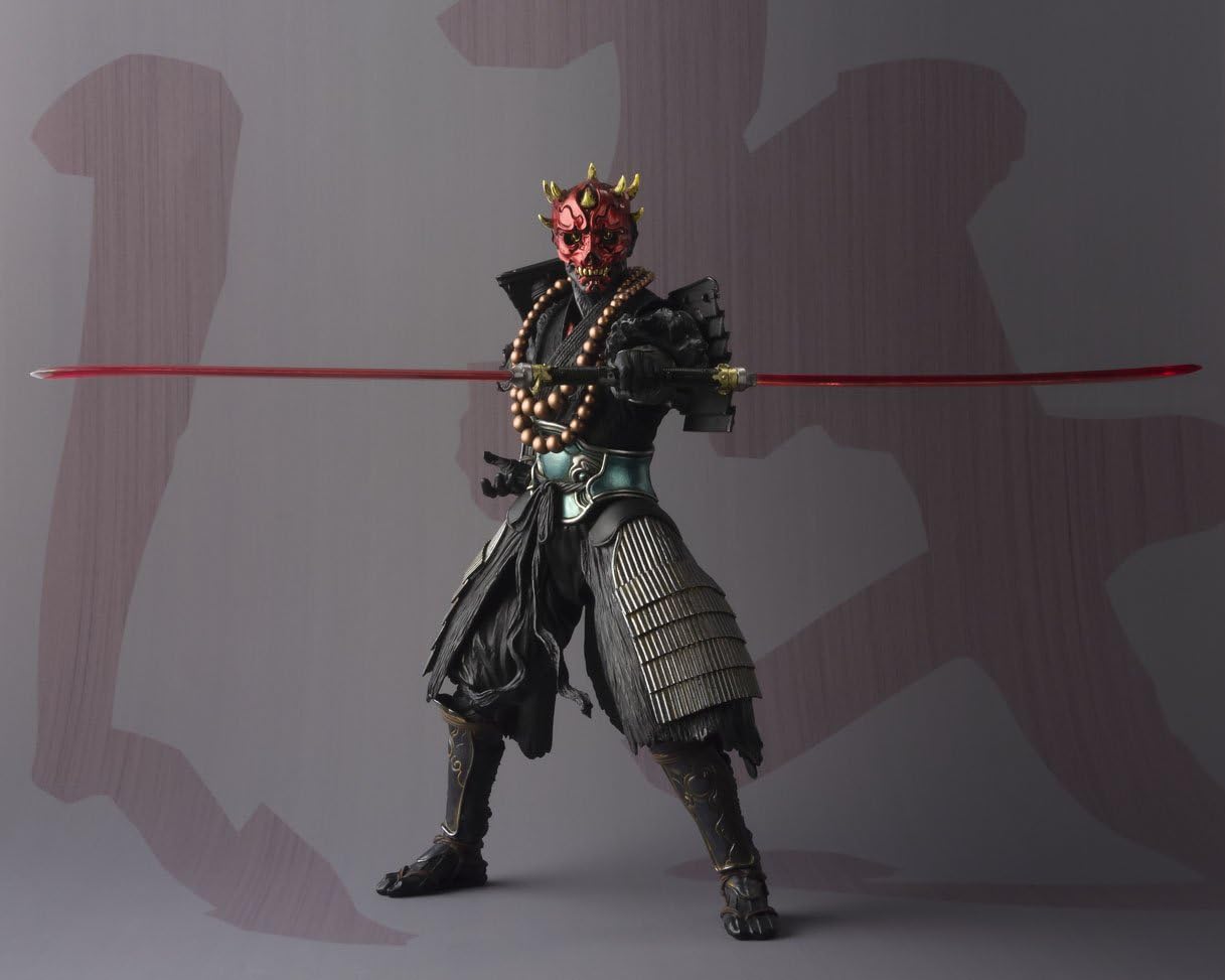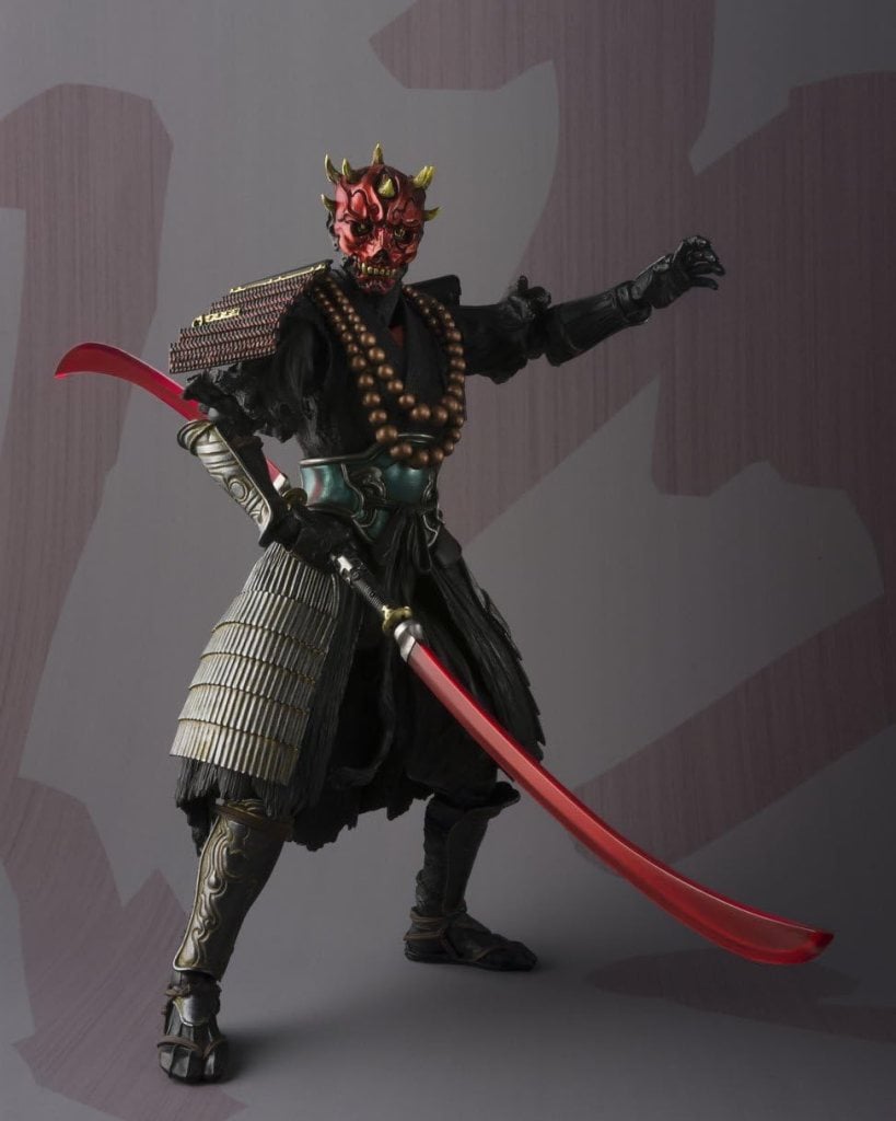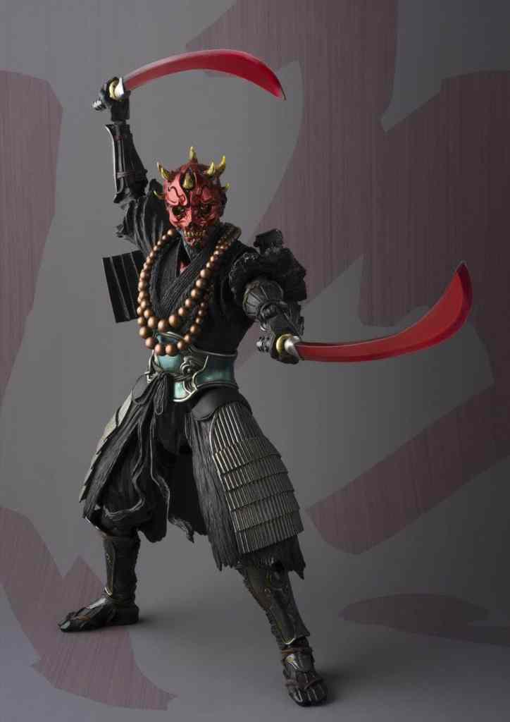Timed for the upcoming new Star Wars film come three consecutive new releases in the Meisho Movie Realization series! The second is Sohei Darth Maul, as envisioned by sculptor Takayuki Takeya. „Sohei“ means warrior monk in Japanese, a perfect fit for this fanatical character. His trademark lightsabers have become a halberd and his face evocative of a fierce Japanese mask. Includes 4 optional pairs of hands, plus twin sword-halberd.