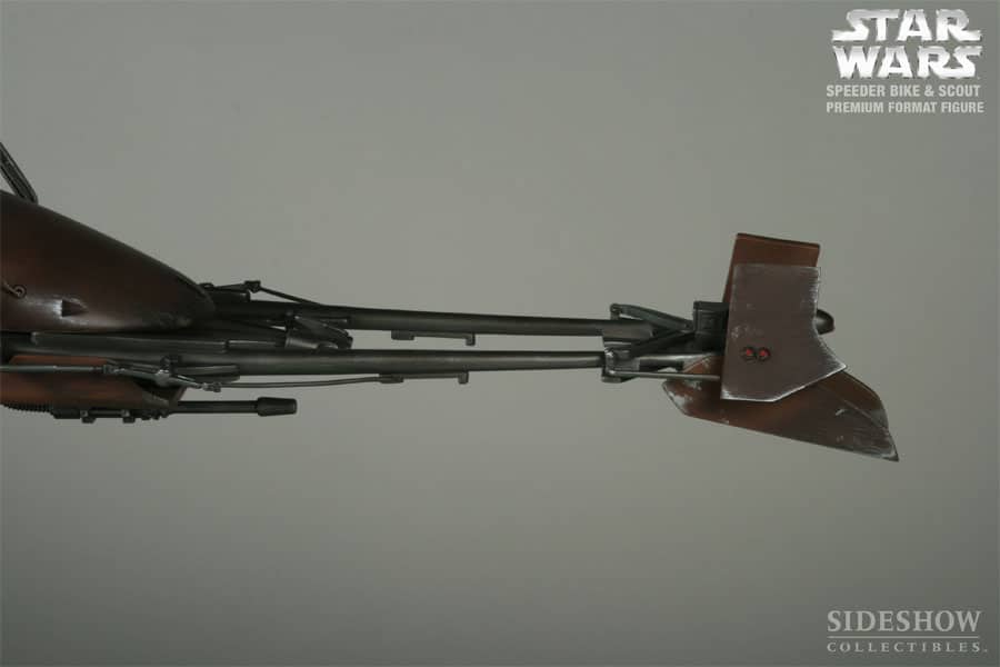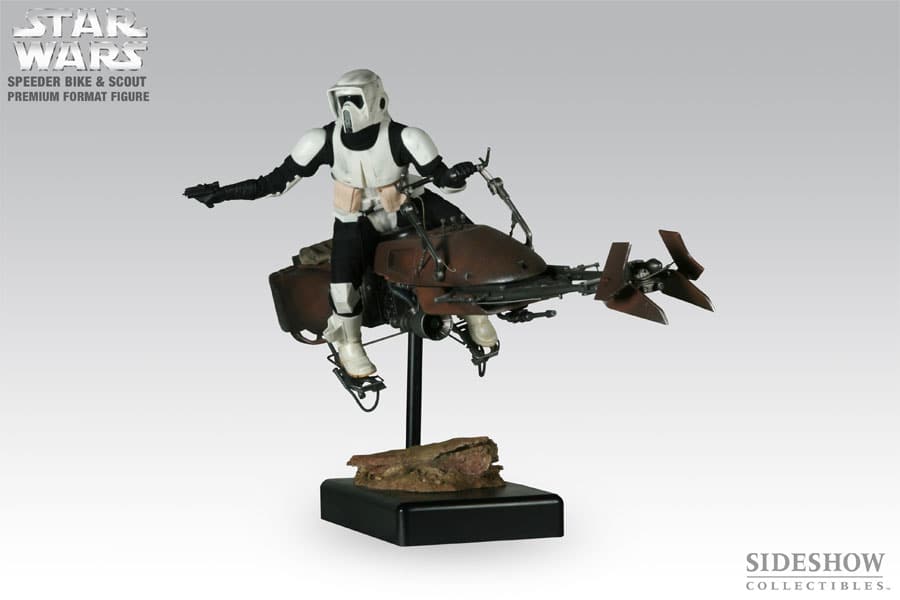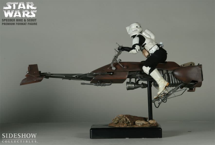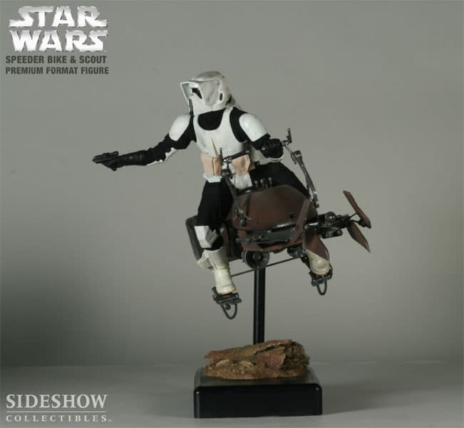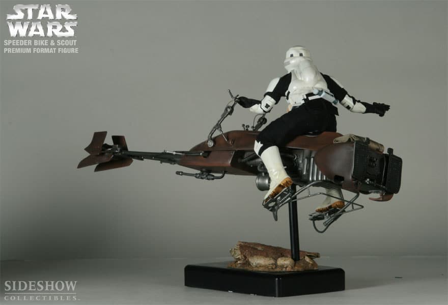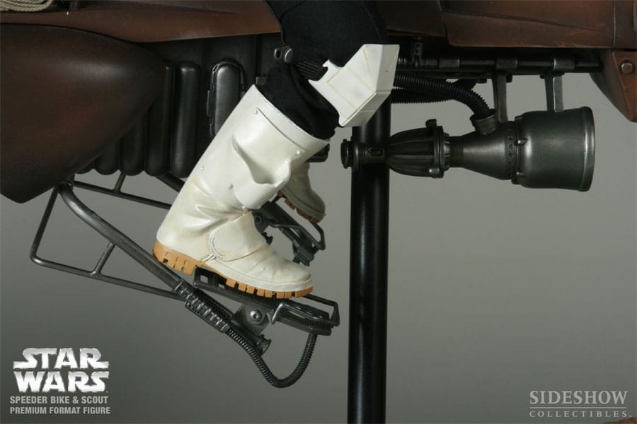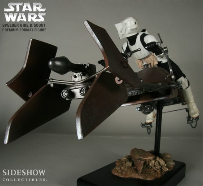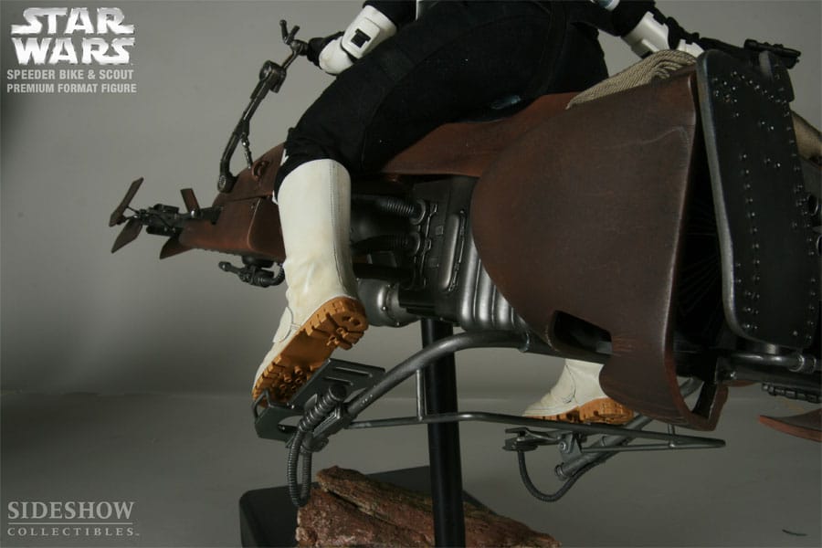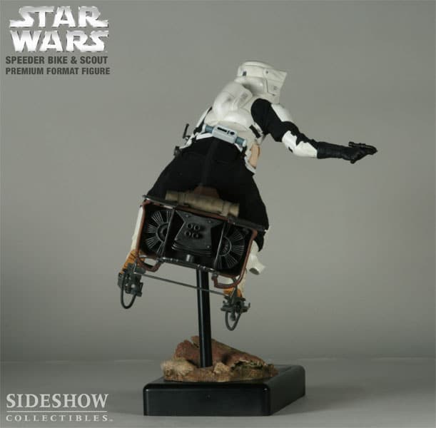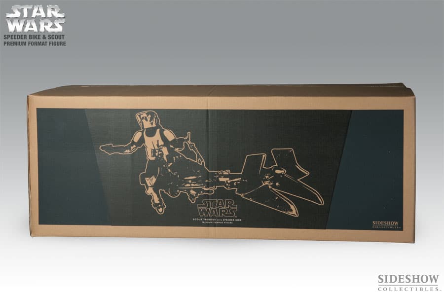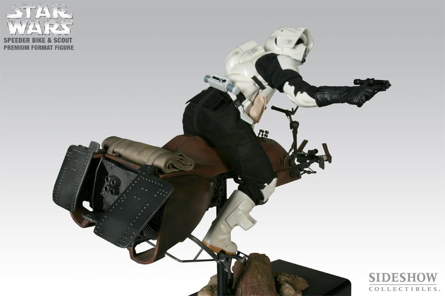The Premium Format 1:4 Scale Speeder Bike and Scout Trooper figure is akin to the stop motion maquettes used in the making of the famous chase sequence in Return of the Jedi. Every detail of the speeder bike and scout trooper has been accurately recreated in 1:4 scale, utilizing a mixture of materials to capture the proper look and feel. The bike is cast in heavy-weight polystone and white metal, and is mounted on a sturdy support rod. The body of the biker scout is cast in high-density foam, and incorporates several points of articulation so that you may adjust the pose and attitude of the trooper’s head and arm. The trooper is costumed in a real fabric body glove, then finished with polystone and metal armor elements. The display base is cast in heavy-weight polystone, and finished on the base bottom with individual hand numbering.