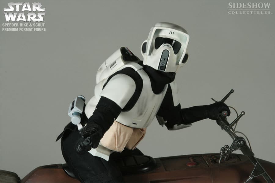 The stormtroopers designated as scouts wear a lightweight armor set with considerably more flexibility than their infantry counterparts. On the forest moon of Endor, Scout Troopers utilize Imperial speeder bikes for their reconnaissance and patrol duties, protecting the newly reconstructed Death Star’s shield generator from the native species and any ambitious rebel forces. The hovering, repulsorlift enabled bikes can attain speeds in excess of 500 kilometers per hour, while remaining unbelievably maneuverable.