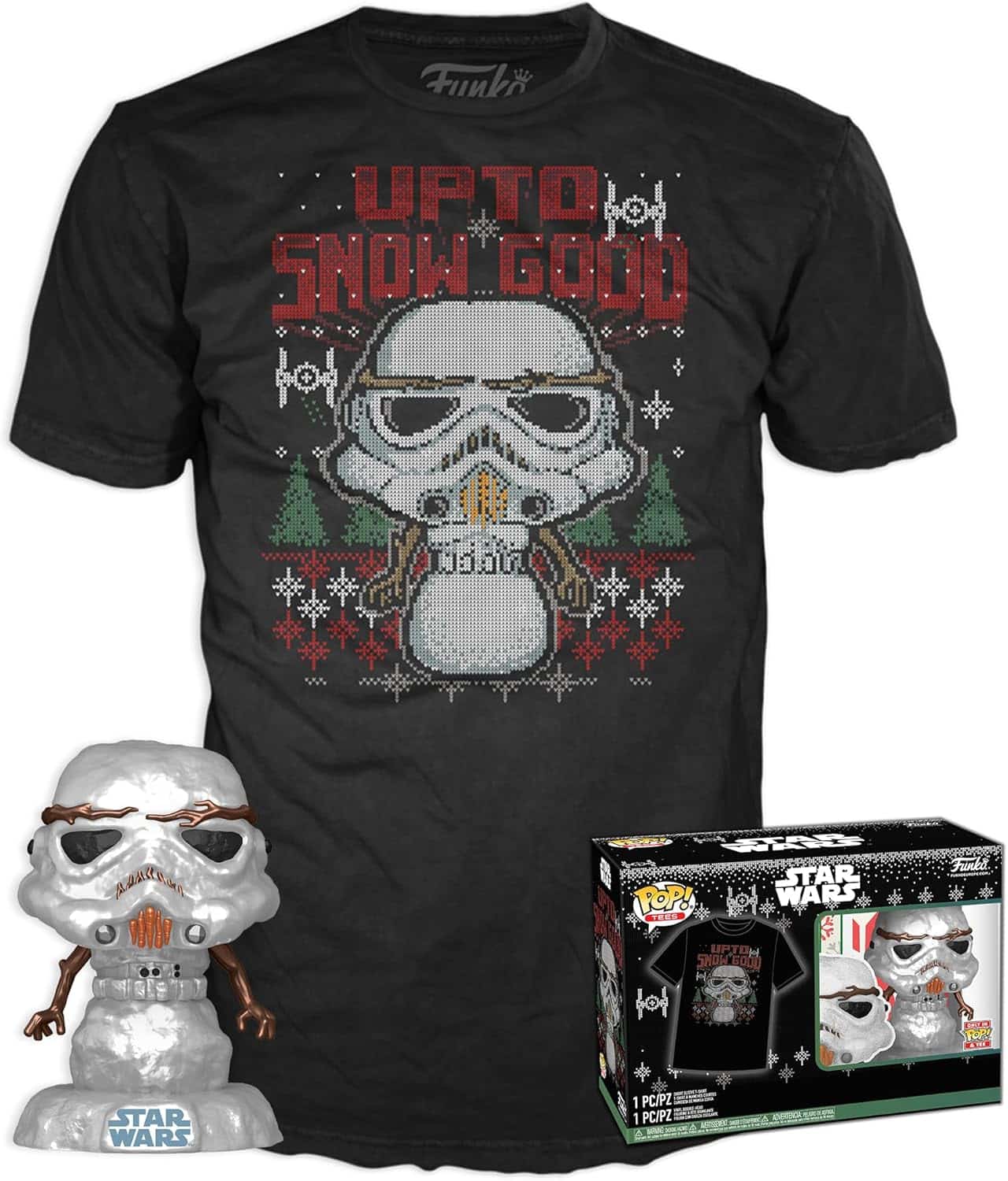 - This Pop! & Tee set includes a matching metallic Pop! Stormtrooper as a snowman and is perfect for showing off your Star Wars pride in your collection and across the galaxy!