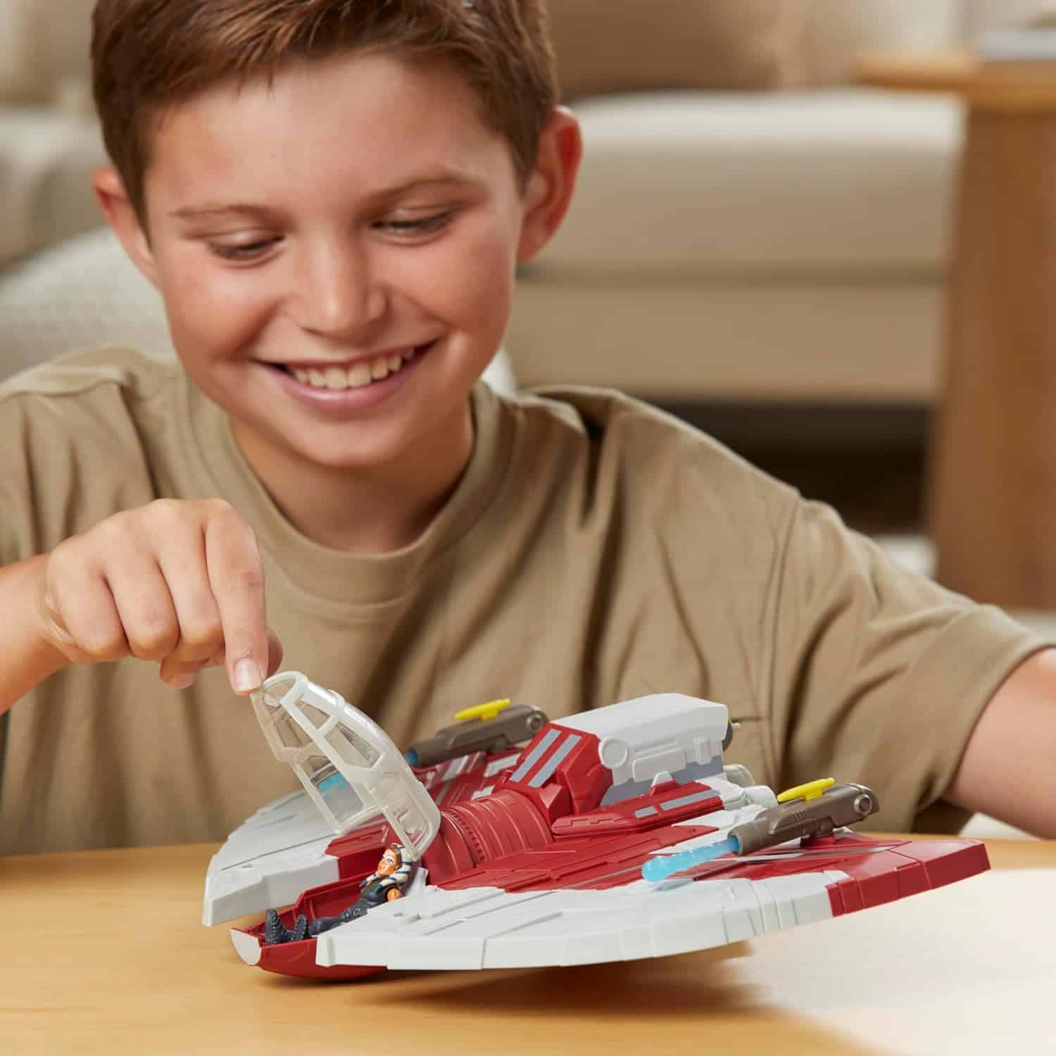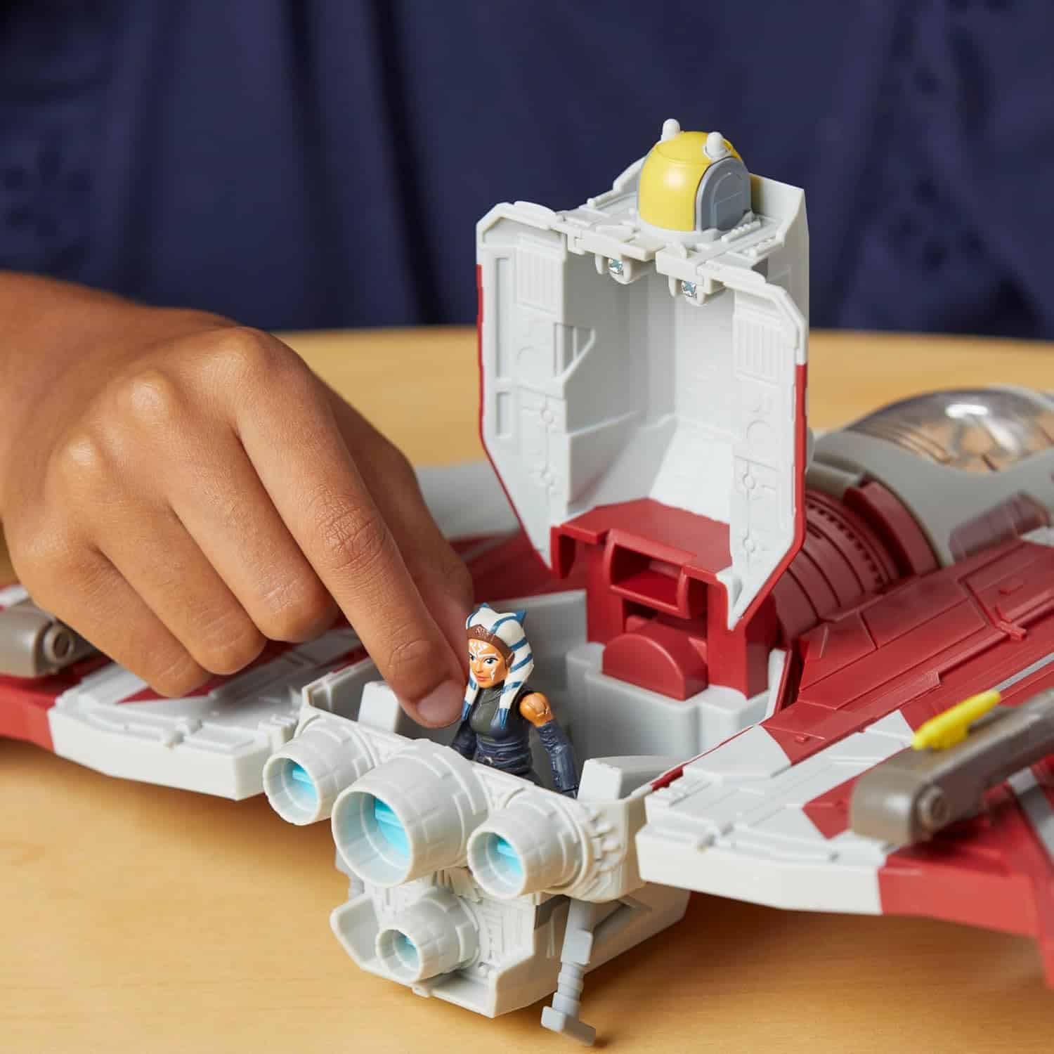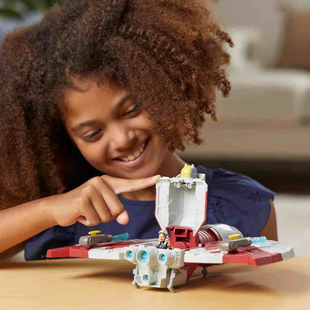 - STAR WARS SCHIFF: Kinder können ihre Lieblingsmomente von Ahsoka mit diesem epischen Star Wars-Fahrzeug neu erfinden. Ahsokas T-6 Jedi-Shuttle ist 30,2 cm breit, enthält ein Cockpit und verfügt über repositionierbare Flügel